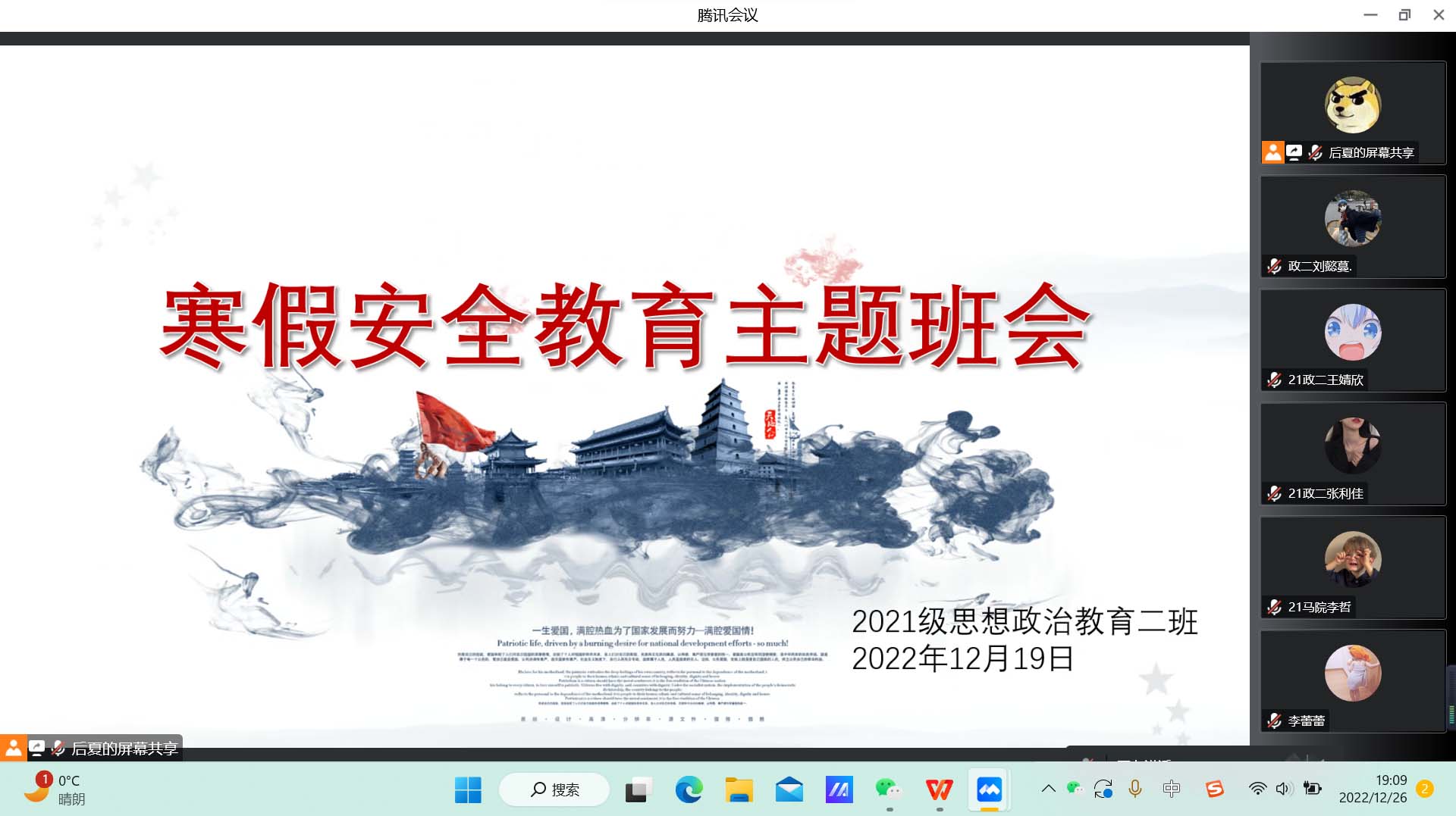 12月19日下午,beat365亚洲版官网2021级思想政治教育二班在腾讯会议召开寒假安全教育主题班会。2021级思想政治教育二班全体成员共同参加此次主题班会。班会由副班长任振豪主持。