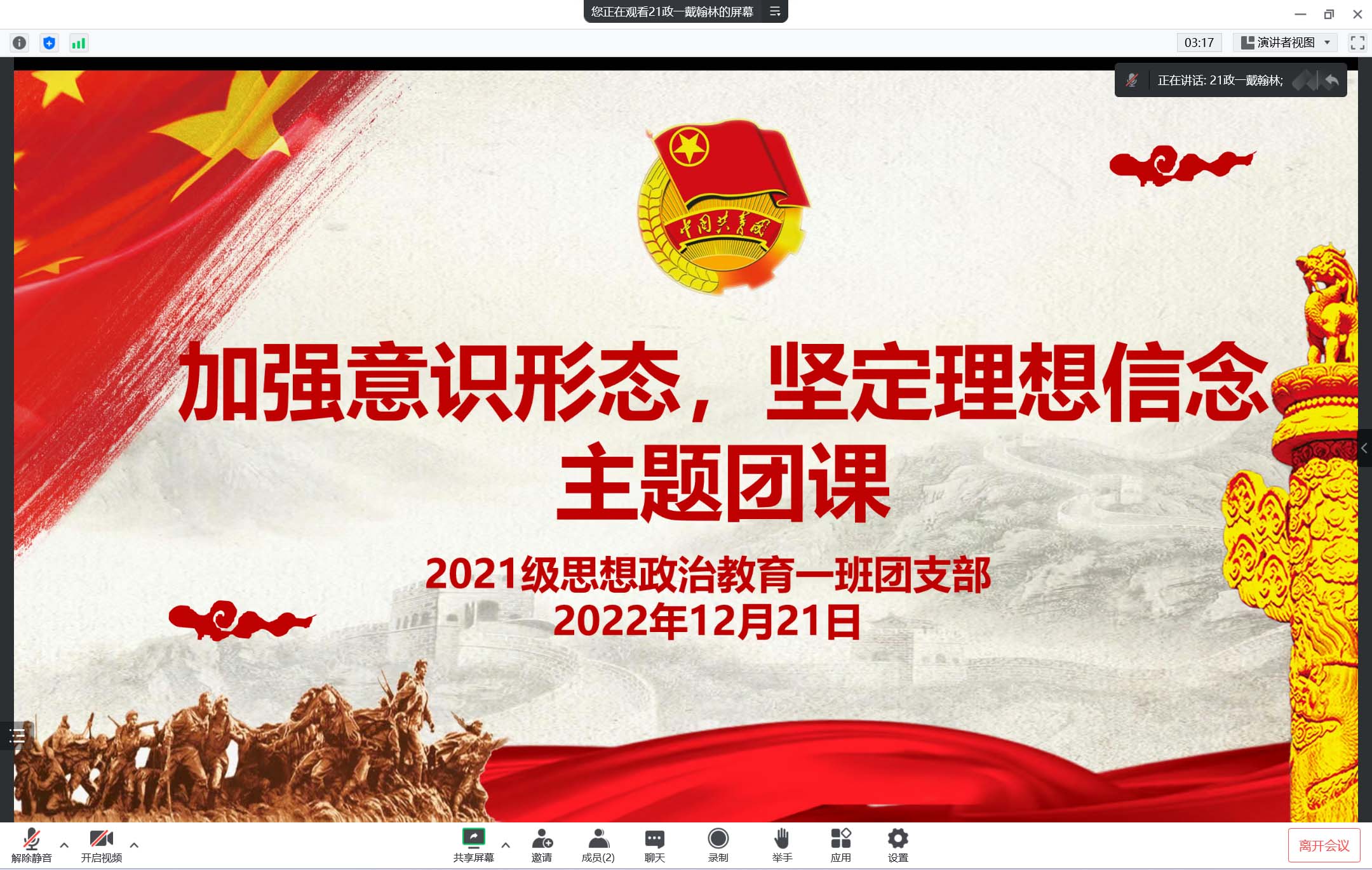 12月21日下午,beat365亚洲版官网2021级思想政治教育一班在腾讯会议召开线上“加强意识形态,坚定理想信念”主题团课。2021级思想政治教育一班全体团员参加了本次团课。团课由团支书戴翰林主持。