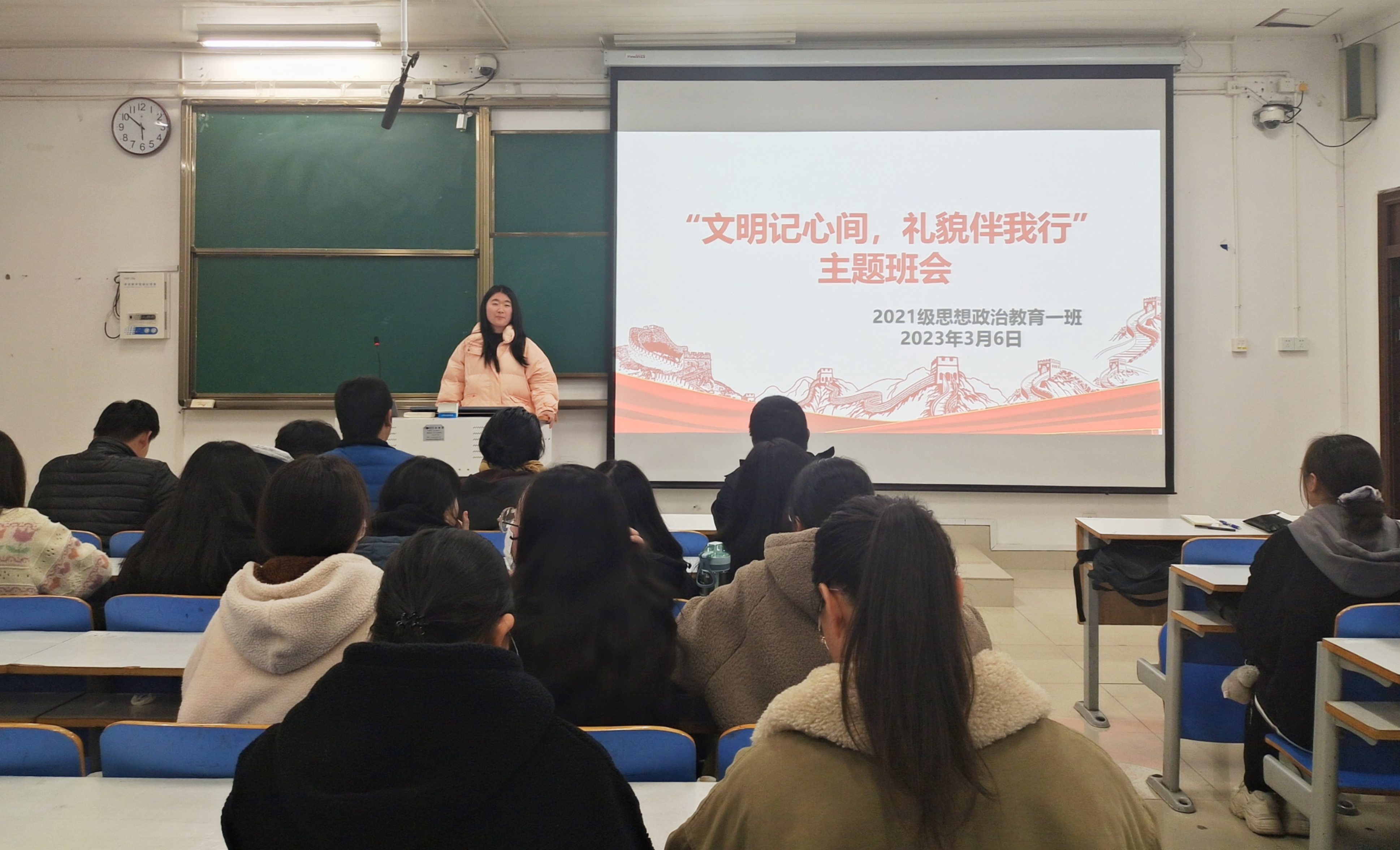 班会伊始,雷敏通过PPT向同学们展示了她近期发现的校园内随意乱丢垃圾、随手摘花、浪费粮食等一系列不文明的照片。她强调,目前校园内不文明现象依然存在,校园文明建设和学生文明素养培育工作任重而道远。随后,她对校园内这些不文明现象产生的原因加以分析,并指出这些行为可能造成的后果,希望同学们加以警示。接着,她对同学们文明礼貌习惯的养成提出了几点建议。一是课堂礼仪。上课要端正态度,认真听讲,严格遵守课堂纪律。二是仪容仪表。穿着要适当、得体、讲究场合。三是言行举止。见到老师要主动问候,与人交往要礼貌用语。