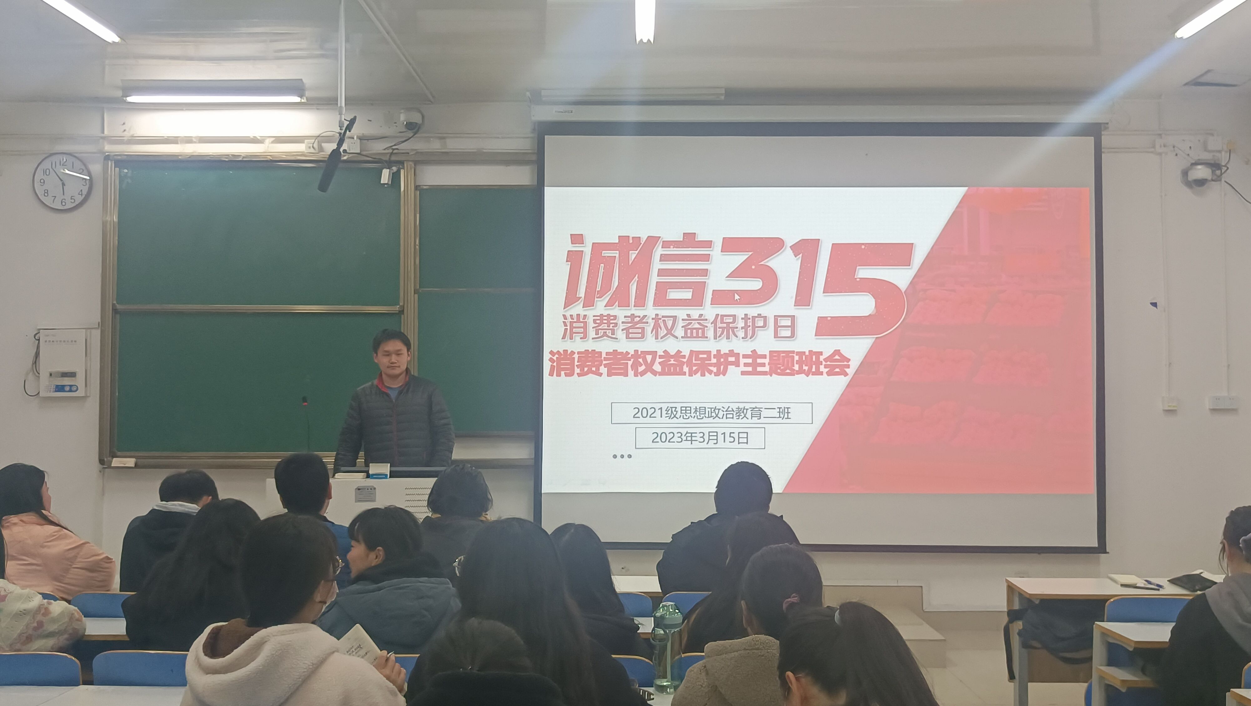 3月15日下午,beat365亚洲版官网2021级思想政治教育二班在社科楼514教室召开消费者权益保护主题班会。2021级思想政治教育二班全体同学参加此次主题班会。班会由副班长任振豪主持。