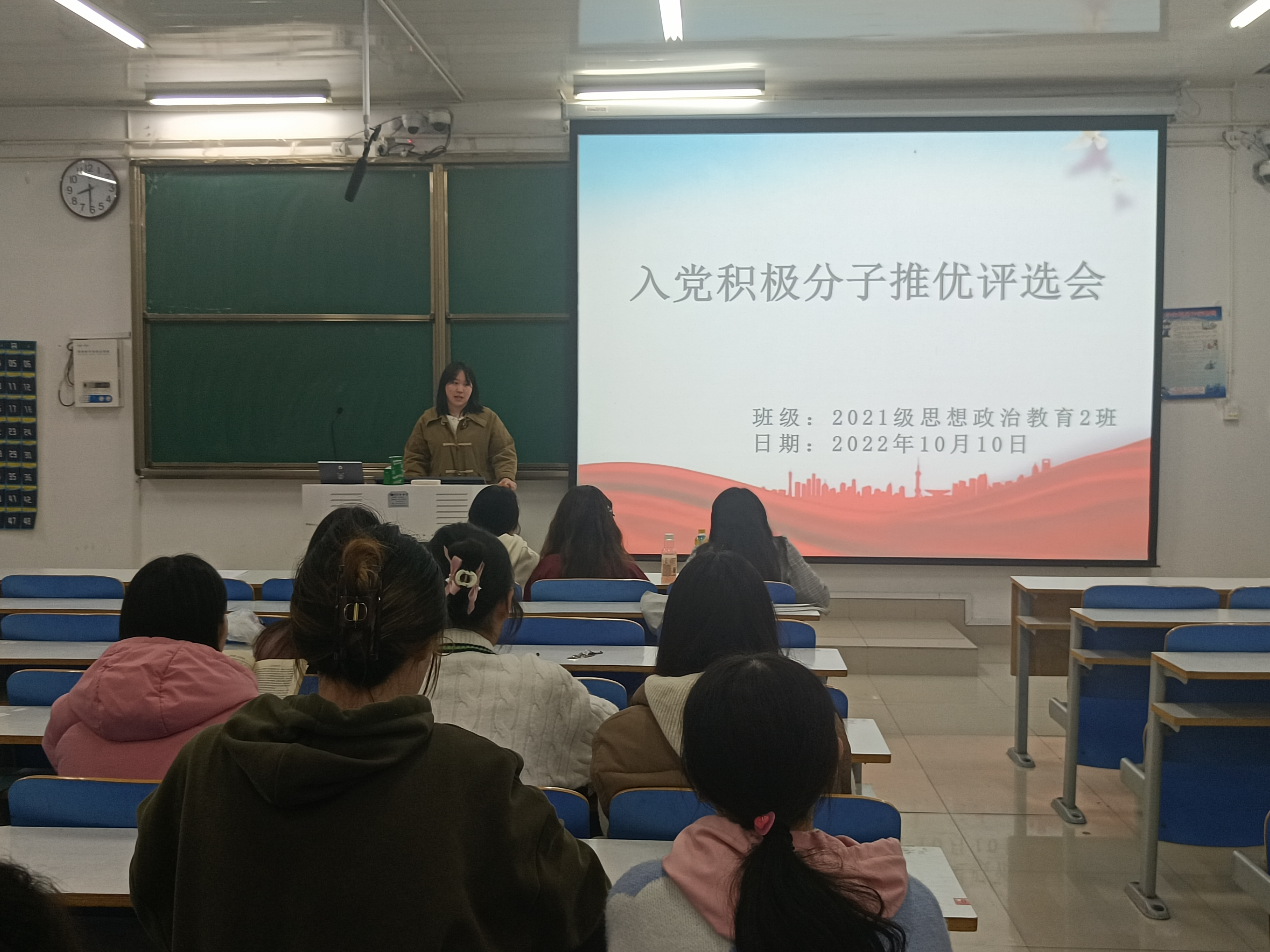 10月10日上午,beat365亚洲版官网2021级思想政治教育二班在社科楼514教室召开入党积极分子推优评选会。2021级思想政治教育二班全体成员参加此次评选会。评选会由团支书王婧欣主持。