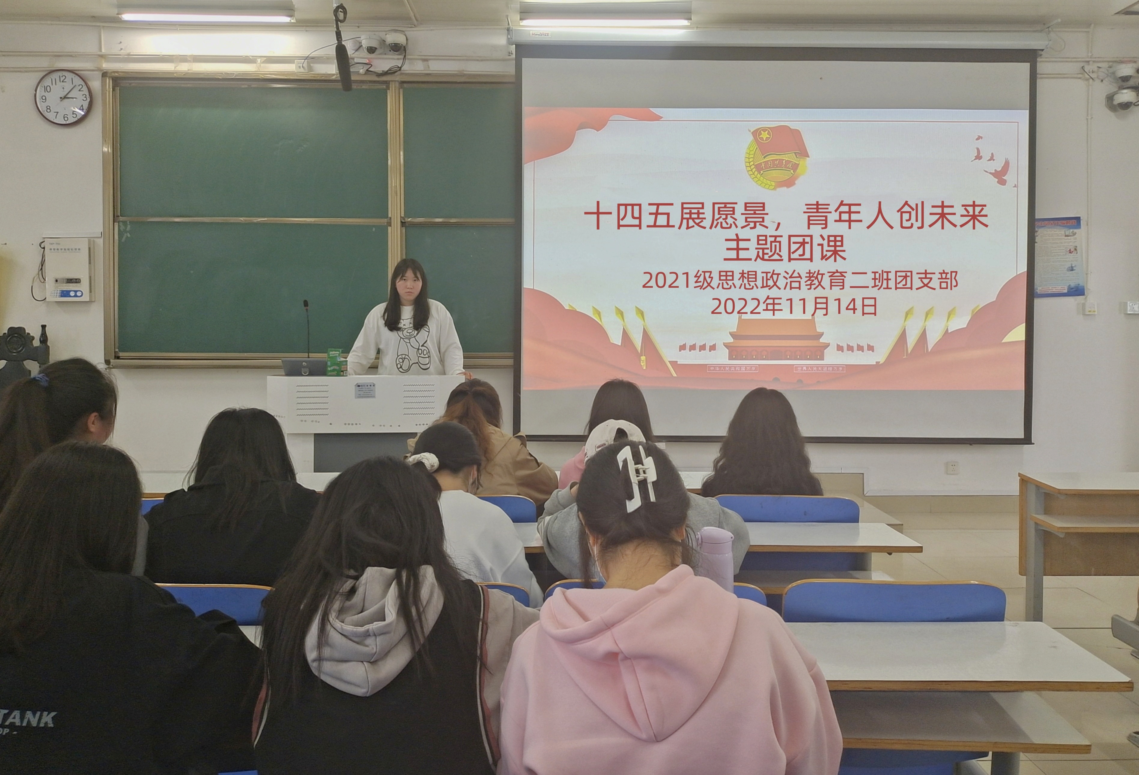 11月14日下午,beat365亚洲版官网2021级思想政治教育二班在社科楼514教室召开“十四五展愿景,青年人创未来”主题团课。2021级思想政治教育二班全体成员共同参加本次主题团课。团课由团支书王婧欣主持。