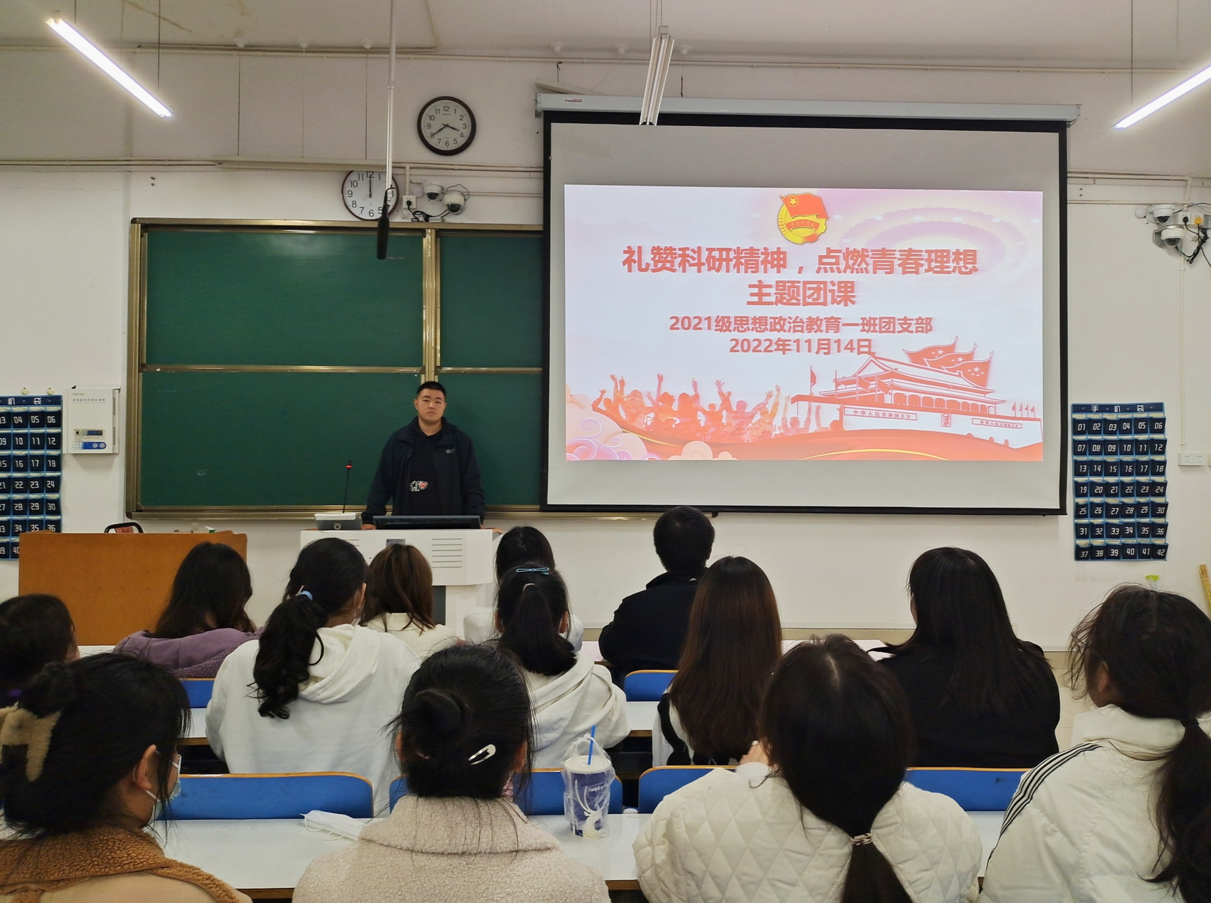 11月14日下午,beat365亚洲版官网2021级思想政治教育一班在社科楼416教室召开“礼赞科研精神,点燃青春理想”主题团课。2021级思想政治教育一班全体团员共同参与本次团课。团课由团支书戴翰林主持。