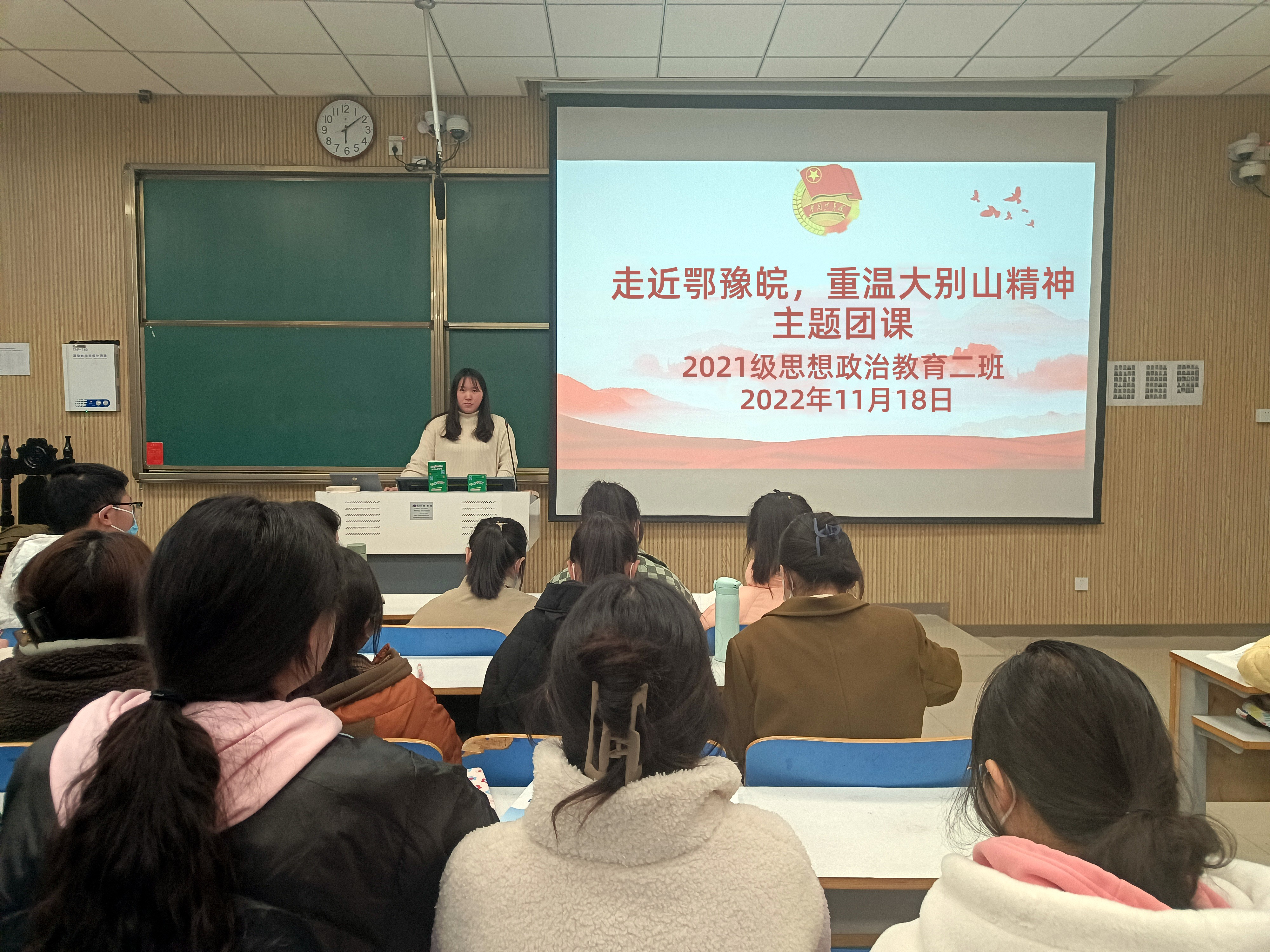 11月18日下午,beat365亚洲版官网2021级思想政治教育二班在社科楼514教室召开“走近鄂豫皖,重温大别山精神”主题团课。2021级思想政治教育二班全体团员共同参加此次团课。团课由团支书王婧欣主持。
