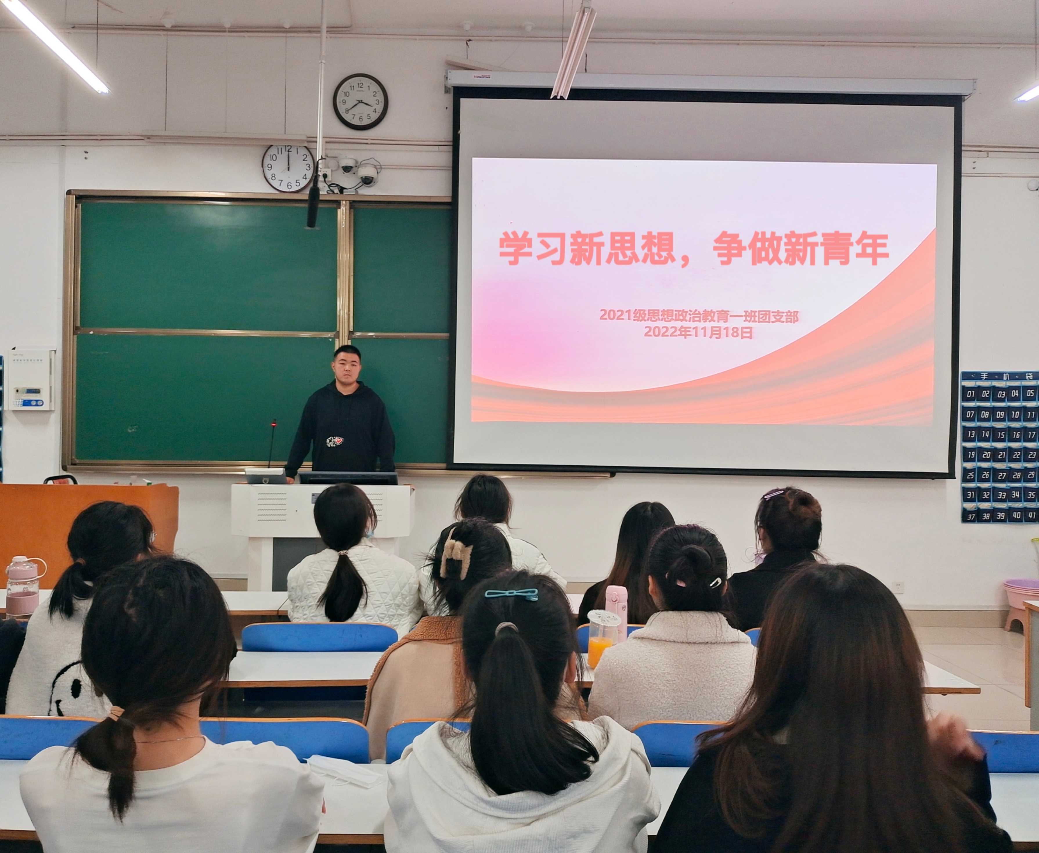 11月22日下午,beat365亚洲版官网2021级思想政治教育一班在社科楼514教室召开“学习新思想,争做新青年”主题班会。2021级思想政治教育一班全体成员共同参与本次会议。会议由团支书戴翰林主持。