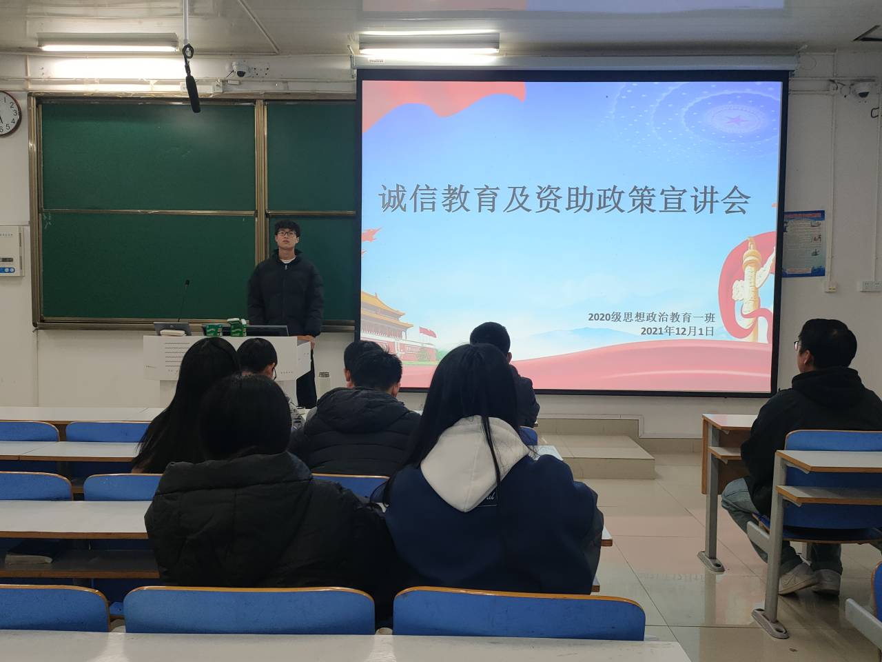 12月1日,beat365亚洲版官网2020级思想政治教育一班在社科楼514教室顺利召开“诚信教育及资助政策”宣讲会。2020级思想政治教育一班全体同学参加本次会议,宣讲会由副班长白帅豪主持。