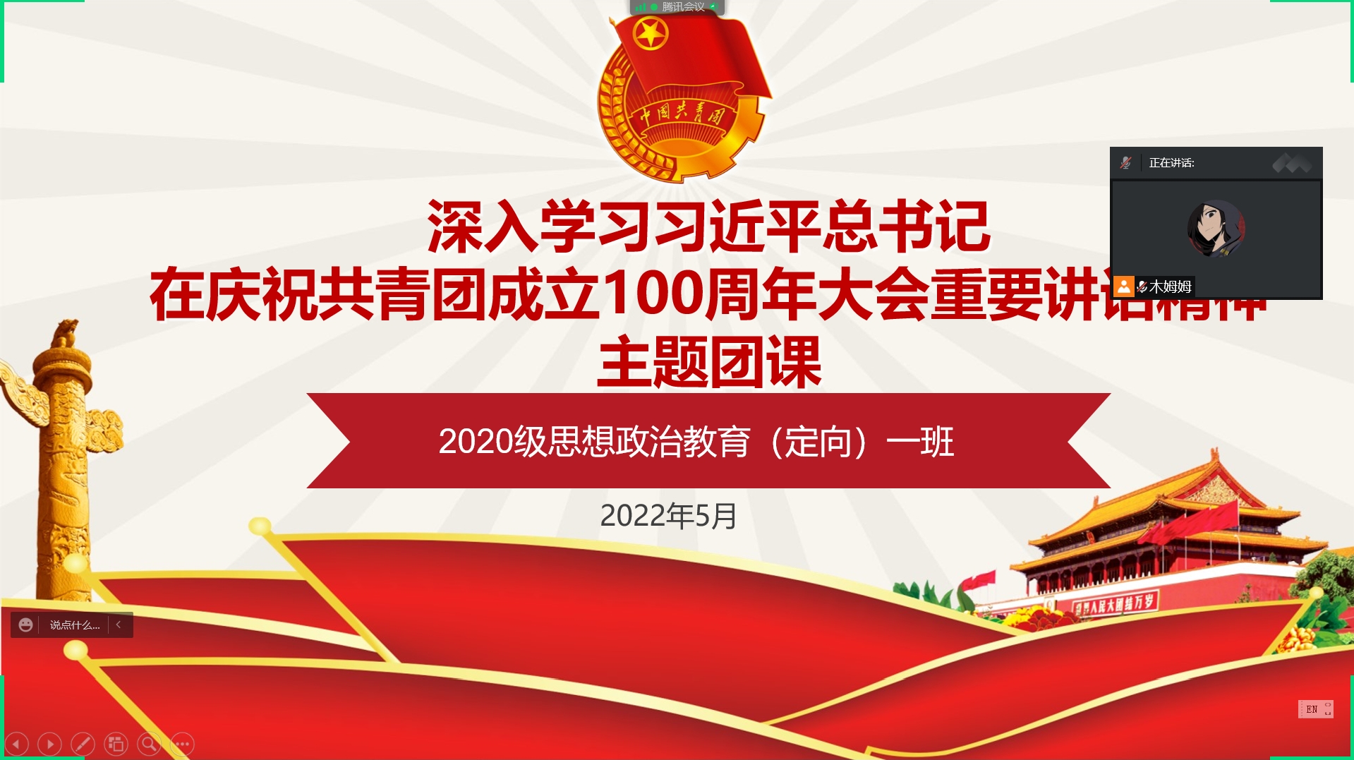5月17日晚,beat365亚洲版官网2020级思想政治教育定向一班通过线上的形式开展了“深入学习习近平总书记在庆祝共青团成立100周年大会重要讲话精神”主题团课。
