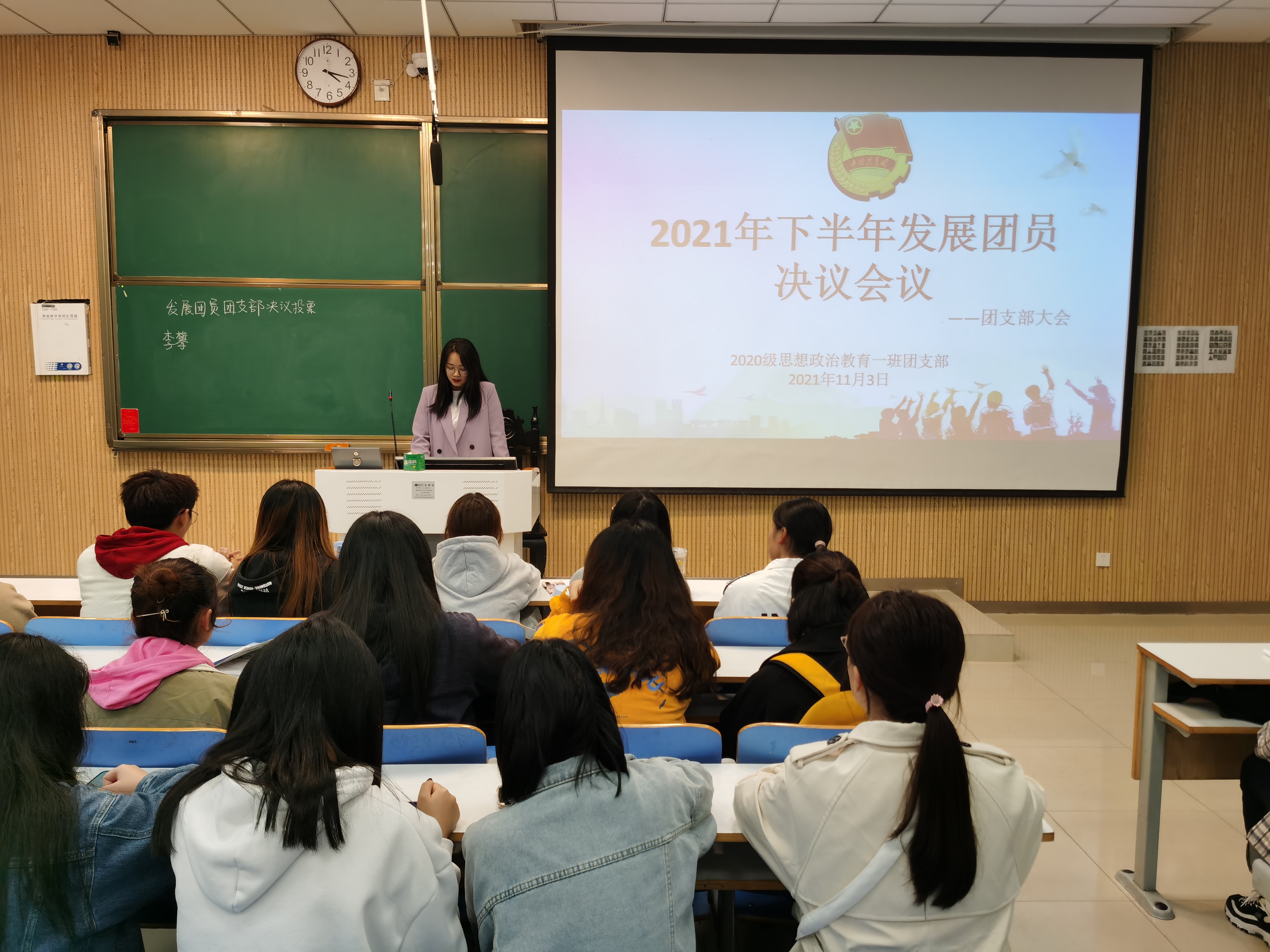 11月4日下午,beat365亚洲版官网 2020 级思想政治教育一班在社科楼515教室召开“2021年下半年发展团员决议”团支部大会。2020 级思想政治教育一班全体团员参加了本次大会,大会由团支书卢茜雨主持。