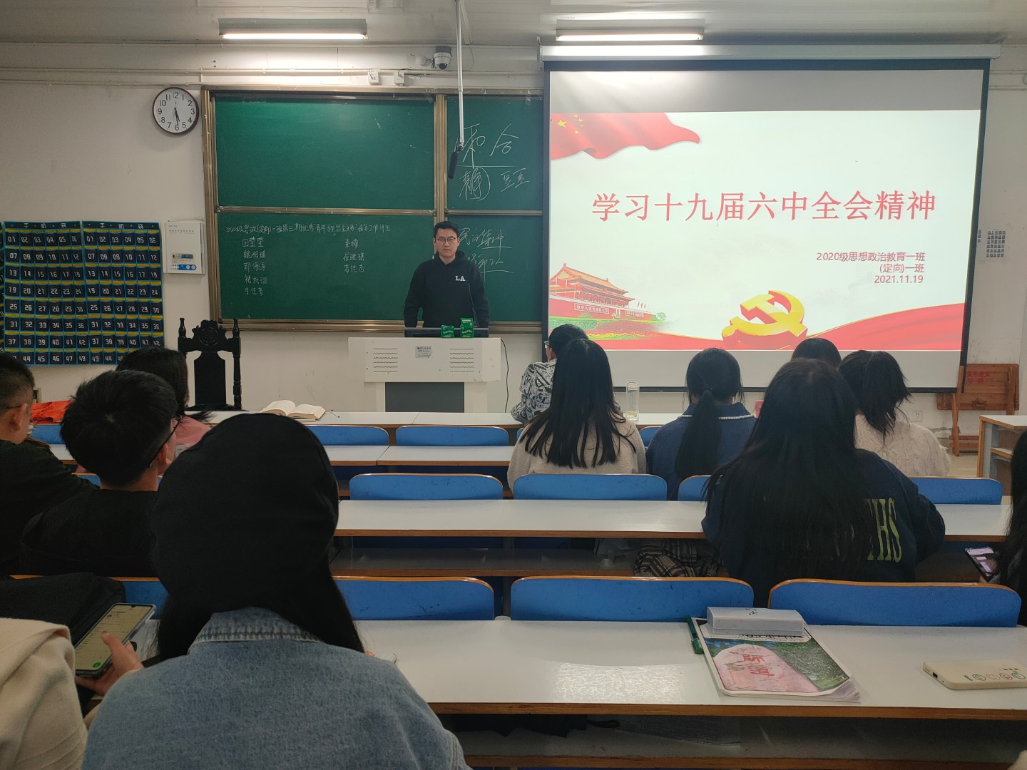 团课伊始,团支书朱紫峰向同学们简述党的十九届六中全会的前言。接着,他通过播放的幻灯片的方式向同学们依次阐述了会议的八大重要内容:一是审议通过《中共中央关于党的百年奋斗重大成就和历史经验的决议》、《关于召开党的第二十次全国代表大会的决议》两个文件;二是总结重大成就和历史经验的三个“需要”;三是马克思主义中国化的三次飞跃;四是百年历程创造的四个伟大成就;五是党的百年奋斗的五大历史意义;六是党的百年奋斗的十大历史经验;七是全党的四个必须;八是党中央的一个号召。最后,朱紫峰为同学们总结了此次全会的会议精神及意义,并邀请同学们上台分享学习会议精神后的心得体会。