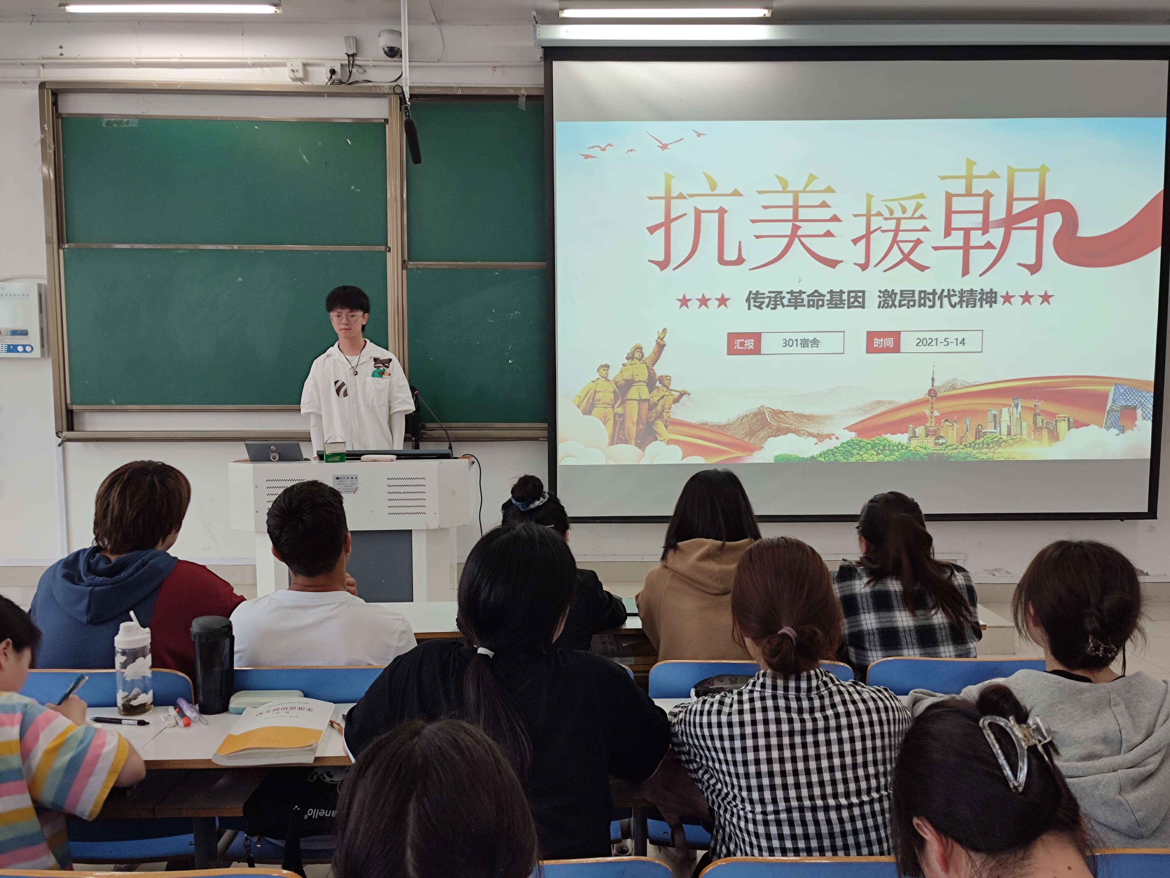 5月14日下午,beat365亚洲版官网2019级思想政治教育一班在社科楼515教室召开以 “抗美援朝”为主题的党史学习教育大会。beat365亚洲版官网2019级思想政治教育一班全体成员参加本次大议。大会由班长贾子漪主持。