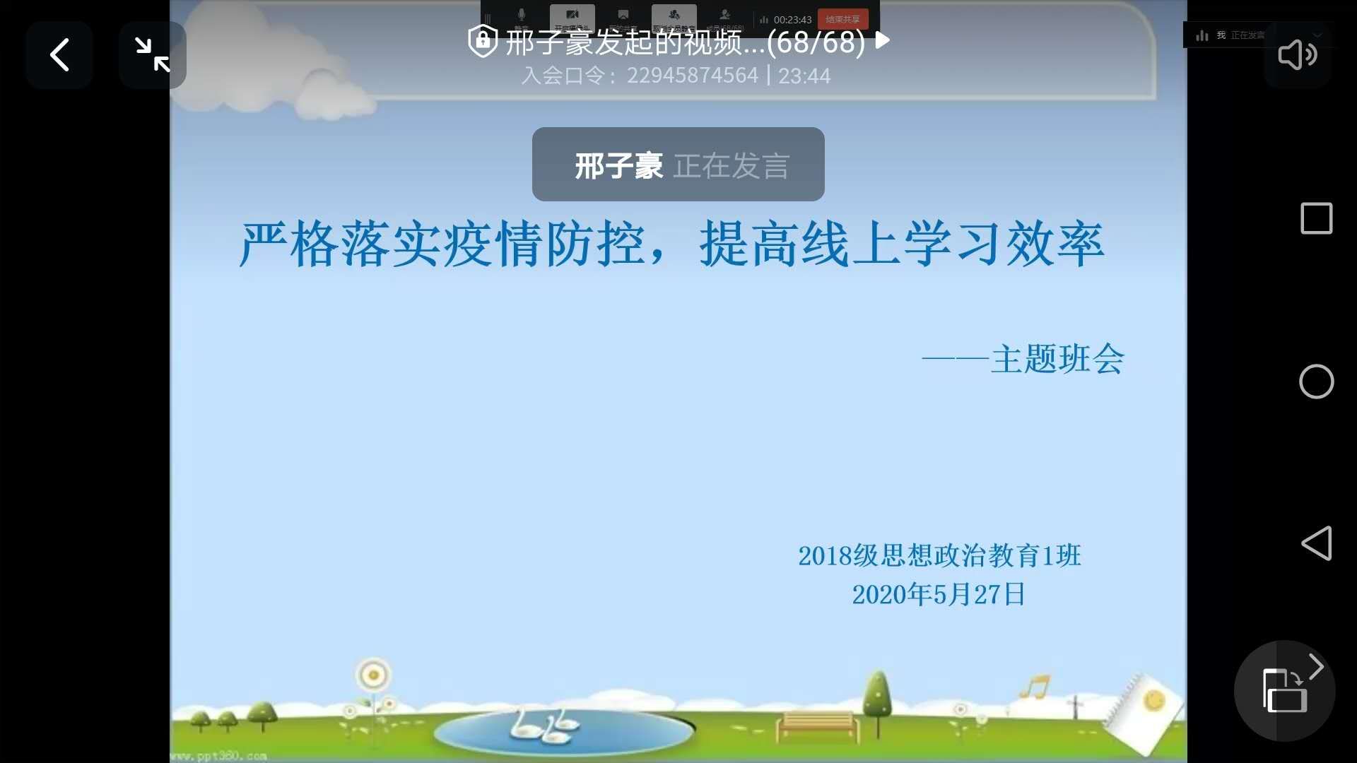为严格落实班级的疫情防控工作,提高学生线上学习效率,5月27日上午,beat365亚洲版官网2018级思想政治教育一班通过钉钉平台顺利开展“严格落实疫情防控,提高线上学习效率”线上主题班会。辅导员曹菁菁、2018级思想政治教育一班全体成员共同参加了此次班会。班会由班长邢子豪主持。