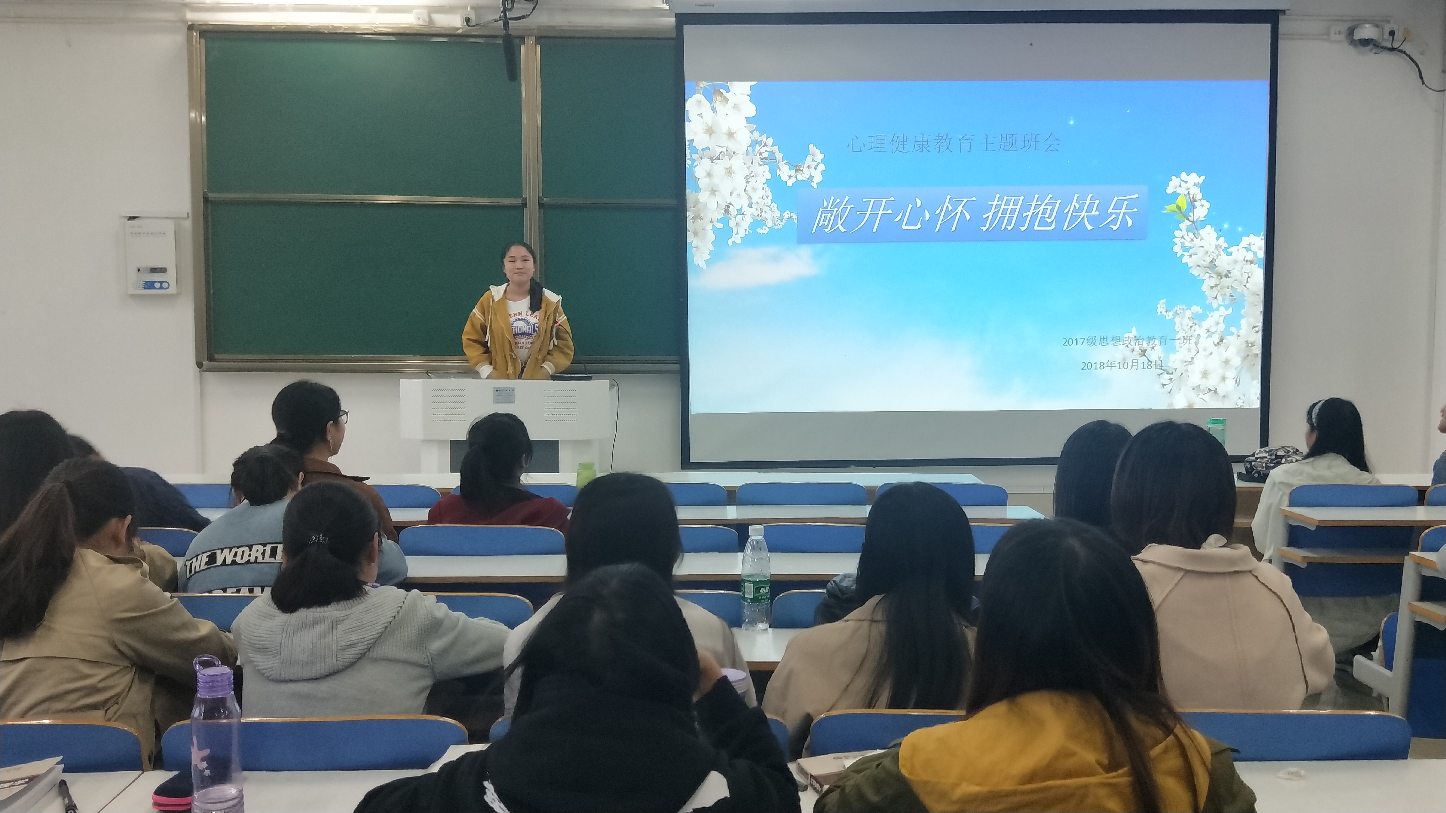 为提高我班学生心理调节能力,保持积极向上的心态,10月22日下午,beat365亚洲版官网2017级思想政治教育一班全体学生在社科楼514教室举办了“敞开心扉,拥抱快乐”主题班会,本次班会由团支书谢文静主持。