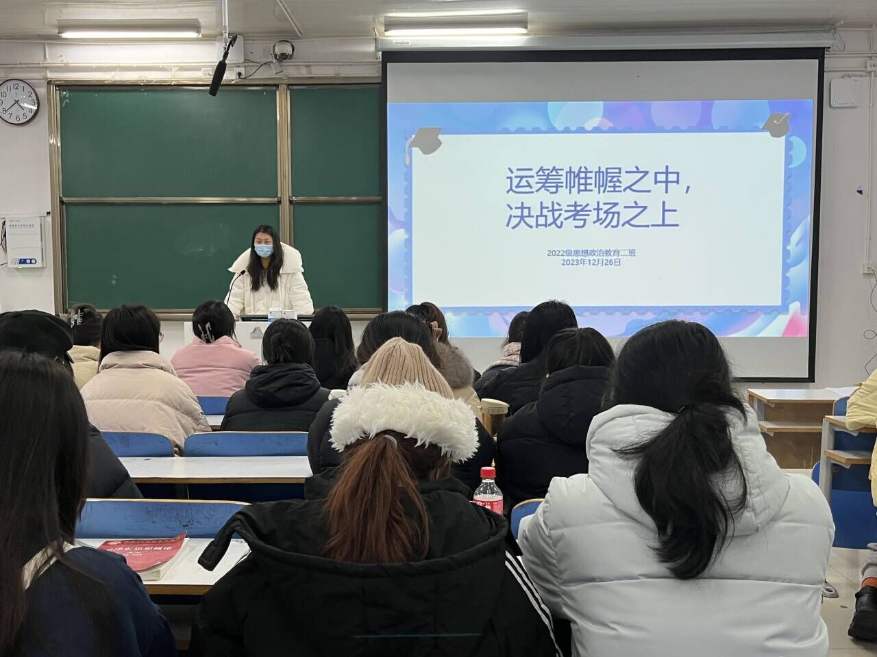 12月26日下午,beat365亚洲版官网2022级思想政治教育二班在社科楼514教室开展“运筹帷幄之中,决战考场之上”期末动员班会。beat365官网2022级思想政治教育二班全体成员共同参与此次班会。会议由班主任杨春艳主持。