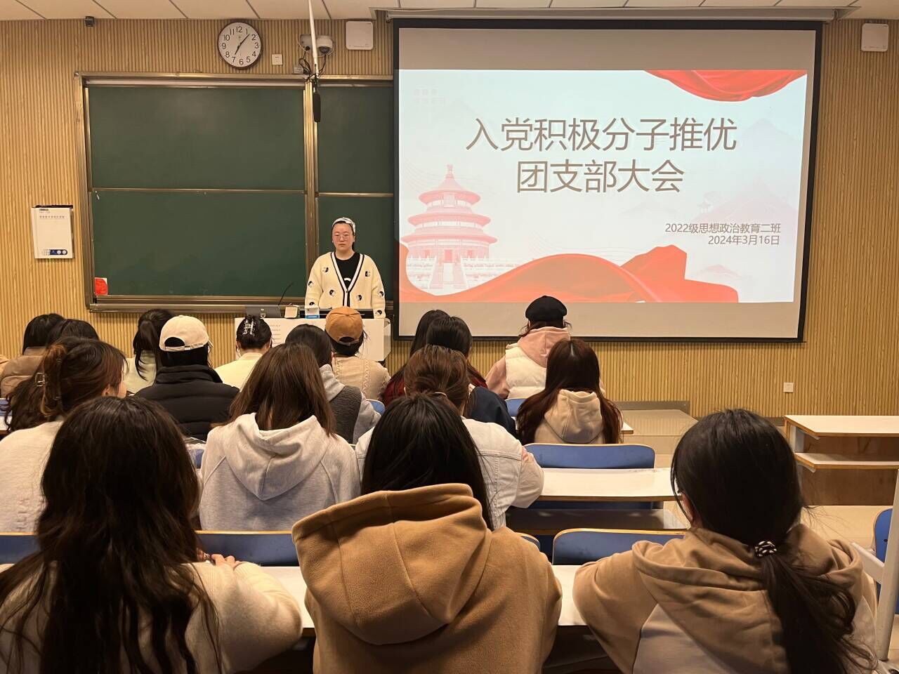 3月16日晚上,beat365亚洲版官网2022级思想政治教育二班在社科楼515教室召开入党积极分子推优团支部大会。beat365官网2022级思想政治教育二班全体团员共同参与此次大会。会议由团支书李佳音主持。
