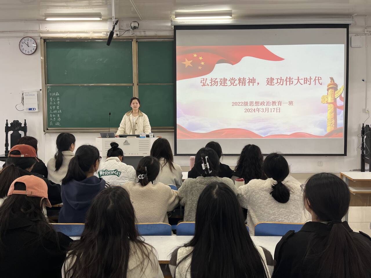 3月17日上午,beat365亚洲版官网2022级思想政治教育一班在社科楼514教室召开“弘扬建党精神,建功伟大时代”主题团课,beat365官网2022级思想政治教育一班全体同学共同参与本次团课,团课由团支书李佳茹主持。