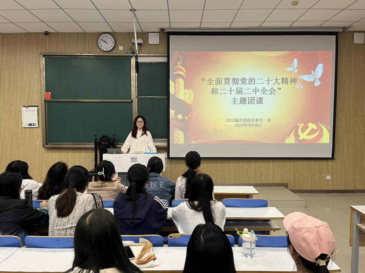 4月18日上午,beat365亚洲版官网2022级思想政治教育一班在社科楼515教室召开“全面贯彻党的二十大精神和二十届二中全会”主题团课,beat365官网2022级思想政治教育一班全体同学共同参与本次团课,团课由团支书李佳茹主持。