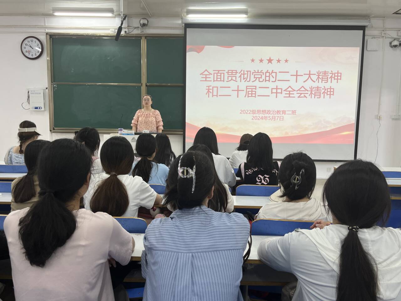 5月7日上午,beat365亚洲版官网2022级思想政治教育二班在社科楼514教室召开全面贯彻党的二十大精神和二十届二中全会精神主题团课。beat365官网2022级思想政治教育二班全体成员共同参与此次团课。团课由团支书李佳音主持。