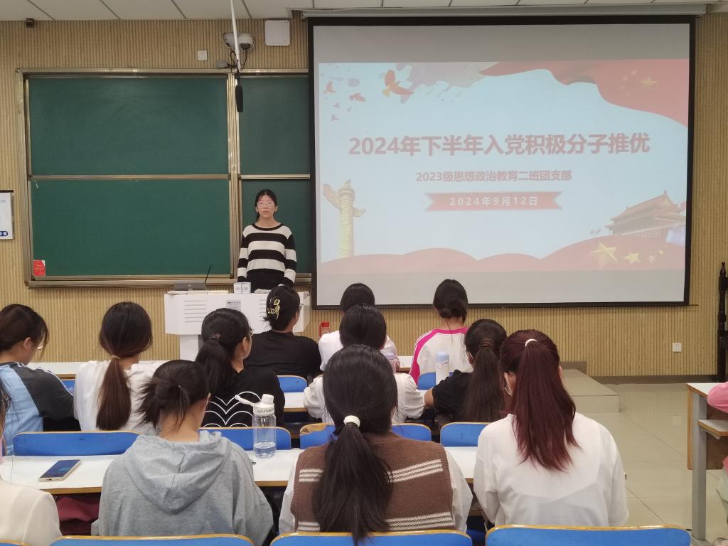 为协助党组织吸纳优秀学生,为党组织增添新活力,9月12日上午,beat365亚洲版官网2023级思想政治教育二班在社科楼515教室开展2024年下半年入党积极分子推优大会。本次推优大会由团支书王慜初主持,全体二班同学参加。