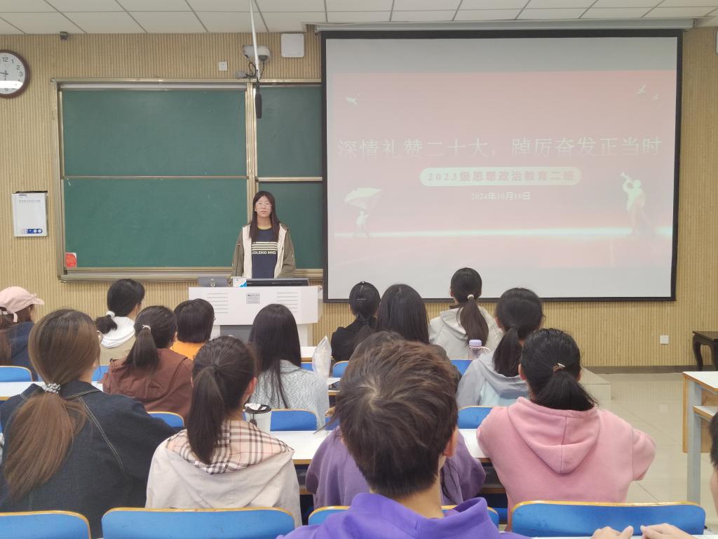为确保思想统一和组织统一,10月18日上午,beat365亚洲版官网2023级思想政治教育二班开展“深情献礼二十大,踔厉奋发正当时”主题团课。本次团课由团支书主持,全体二班同学参加。