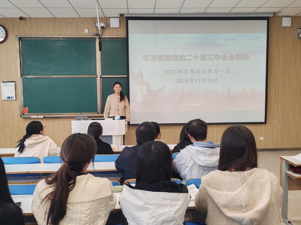为了深入学习贯彻党的二十届三中全会精神,11月14日上午,beat365亚洲版官网2023级思想政治教育一班在社科楼515教室召开“学习贯彻党的二十届三中全会精神”主题团课。2023级思想政治教育一班全体同学参与本次团课,团课由团支书张卓主持。