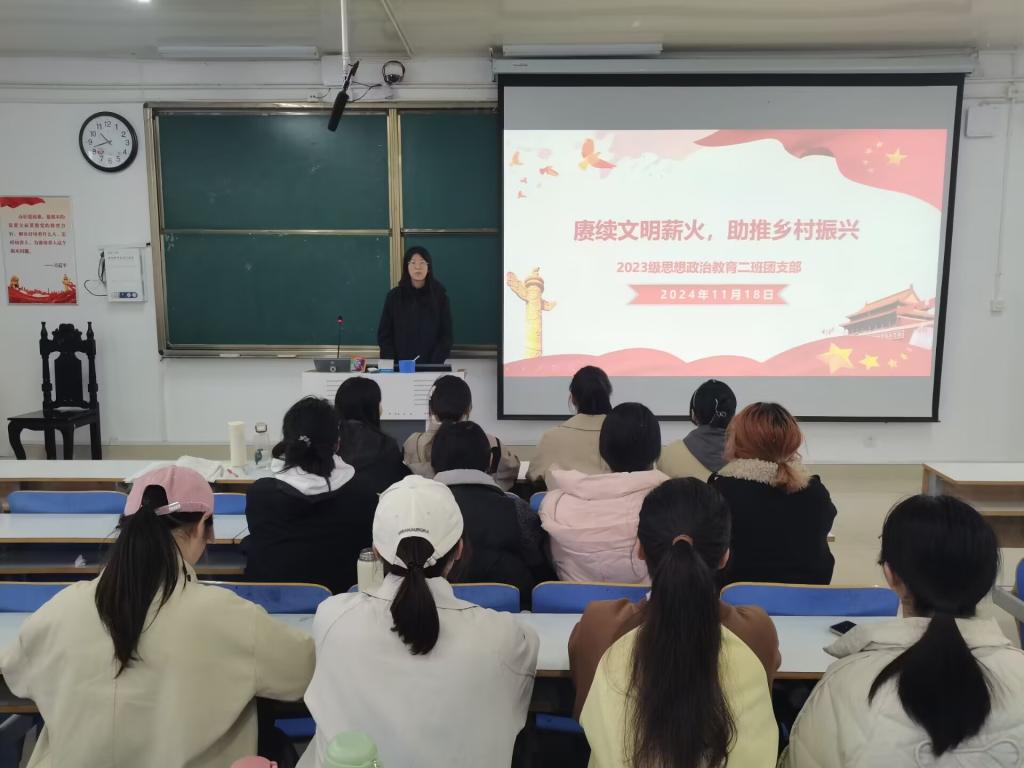 为推动青年大学生深入学习国家政策,增强历史使命感和责任感,11月18日上午,beat365亚洲版官网2023级思想政治教育二班在社科楼515教师开展“赓续文明薪火,助推乡村振兴”主题团课。本次团课由团支书王慜初主持,全体二班同学参加。