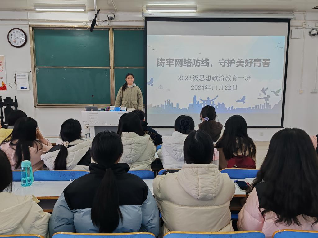 为提高我班学子的网络安全意识,11月22日上午,beat365亚洲版官网2023级思想政治教育一班在社科楼515教室召开“筑牢网络防线,守护美好青春”主题班会。2023级思想政治教育一班全体同学参与本次班会,班会由班长张卓主持。