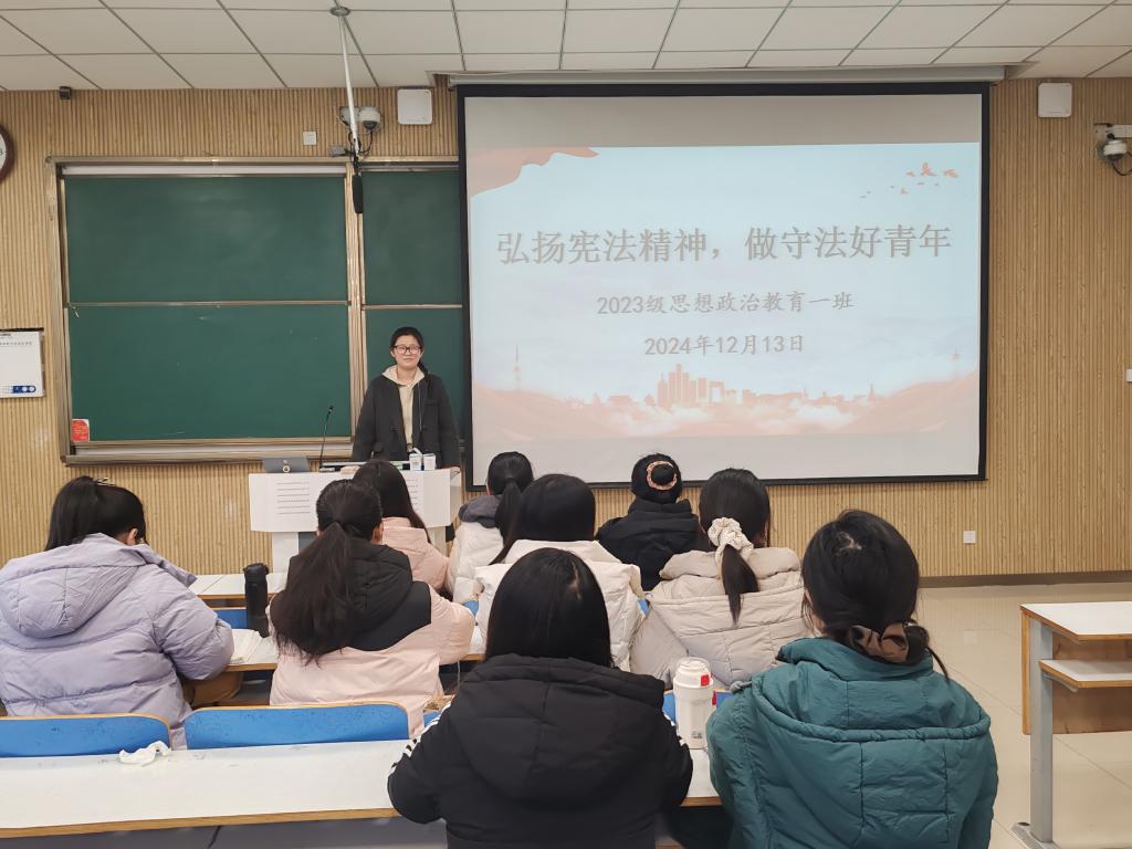 为增强我班学子的宪法意识,推动法治观念深入人心。2024 年12月13日,beat365亚洲版官网 2023 级思想政治教育一班召开“弘扬宪法精神,做守法好青年”主题班会。2023级思想政治教育一班全体同学参与本次团课,团课由团支书张卓主持。