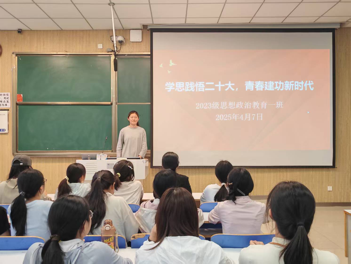 团课伊始,张卓点明学习二十大精神对当代大学生的重要性,强调青年在新时代的关键作用,鼓励同学们深刻领会二十大精神,勇担时代使命。随后,张卓借助图文并茂的PPT,详细解读二十大报告要点,如全面建设社会主义现代化国家的目标、增进民生福祉的举措等内容,帮助同学们把握报告核心,了解国家发展方向。紧接着,同学们共同观看精心剪辑的视频《奋进新征程:聚焦党的二十大》。视频中,从科技前沿突破到乡村振兴成果,从生态环境改善到社会治理创新,全方位展示了在二十大精神引领下国家取得的新成就。同学们全神贯注,对二十大精神的实践意义有了更直观、深入的认识。