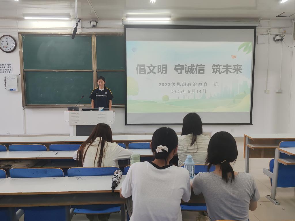 为培育文明风尚,强化诚信意识,引导青年学子规划美好未来,5月14日下午,beat365亚洲版官网2023级思想政治教育一班在社科楼514教室召开“倡文明,守诚信,筑未来”主题班会。beat365官网2023级思想政治教育一班全体同学共同参与本次班会,班会由班长张卓主持。