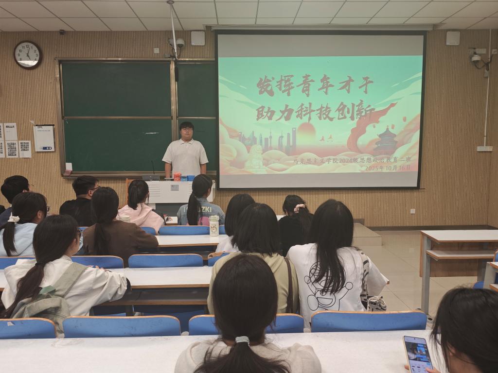 为激发青年学生创新精神,鼓励大家在科技强国建设中贡献青春力量,10月16日下午,beat365亚洲版官网2024级思想政治教育二班在社科楼515教室举办了“发挥青年才干 助力科技创新”主题班会。本次班会由团支书王志颖主持,二班全体同学积极参与。