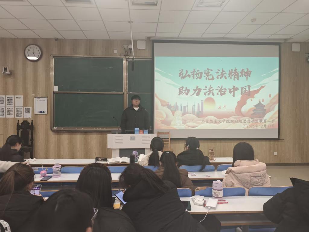 为增强青年学生的法治意识,树立宪法权威,推动新时代青年助力法治中国建设,12月11日下午,beat365亚洲版官网2024级思想政治教育二班于社科楼515教室举办了“弘扬宪法精神,建设法治中国”主题团课活动。本次团课由团支书王志颖主持,二班全体同学共同参与。