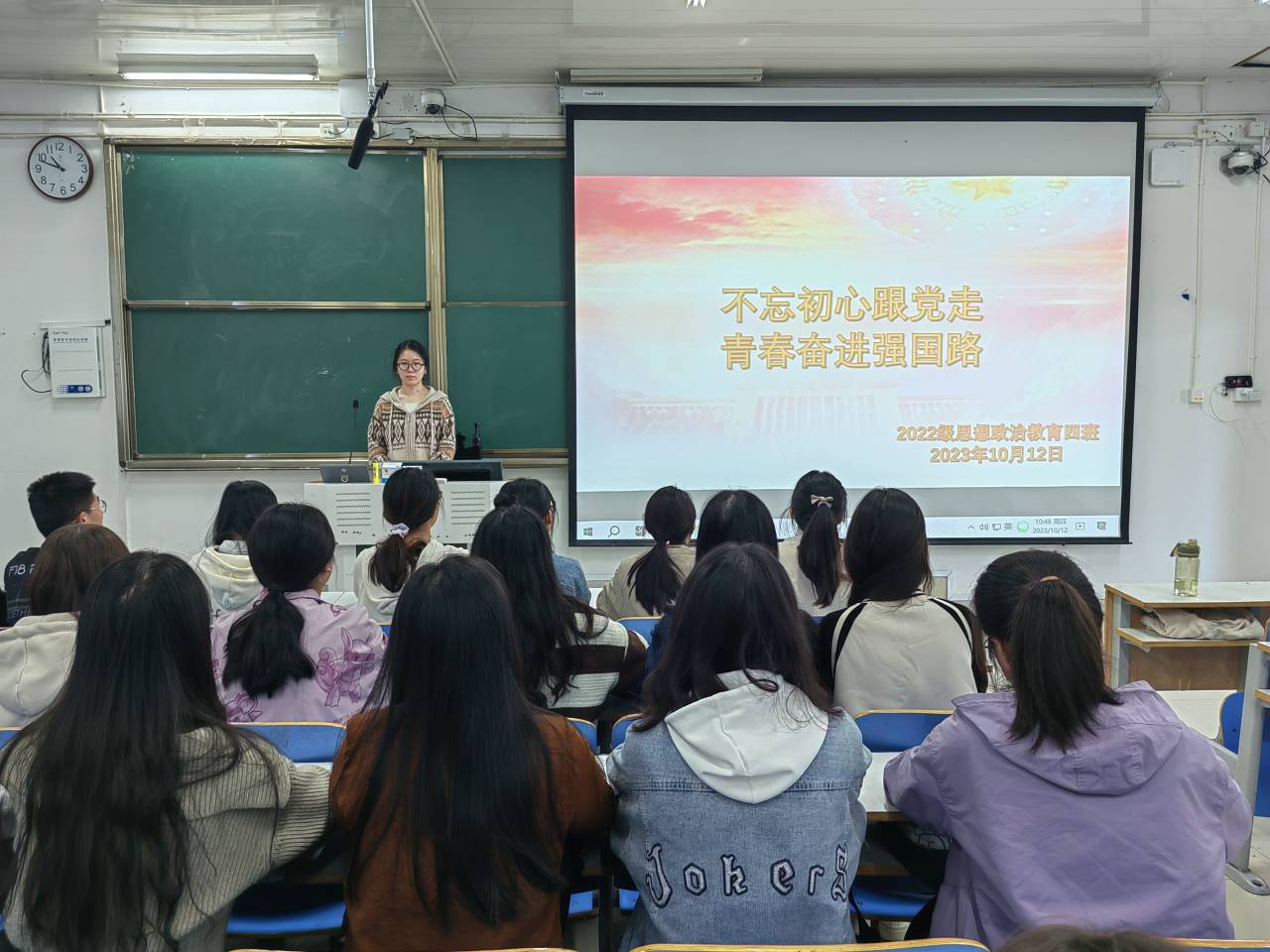 10月12日下午,beat365亚洲版官网2022级思想政治教育四班在社科楼514教室召开“不忘初心跟党走,青春奋进强国路”主题团课。beat365官网2022级思想政治教育四班全体同学参与本次班会。本次团课由团支书牛志杰主持。