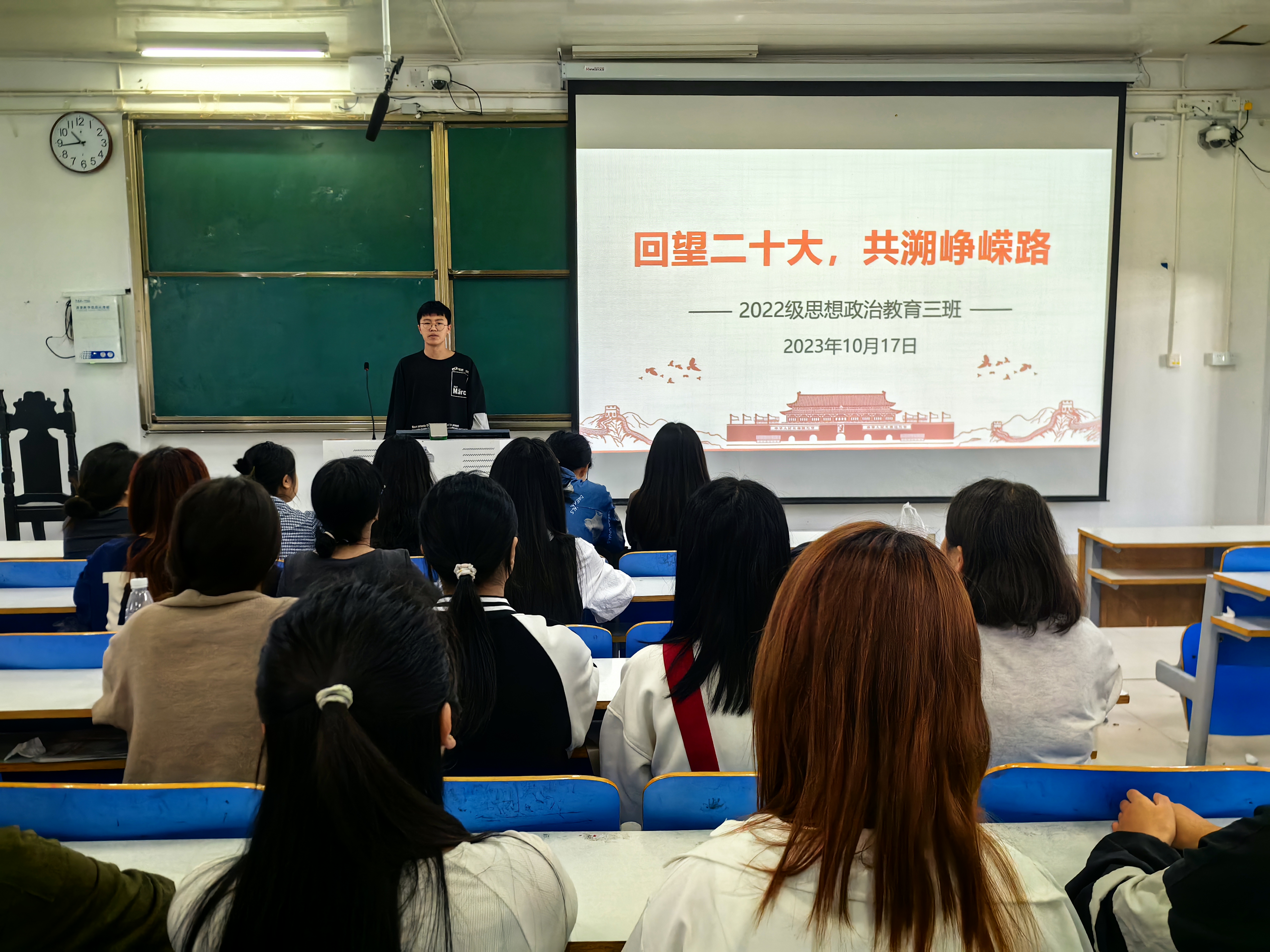 10月17日下午,beat365亚洲版官网2022级思想政治教育三班在社科楼515教室召开“回望二十大,共溯峥嵘路”主题团课。beat365官网2022级思想政治教育三班全体成员共同参加本次团课,团课由团支书余浩洋主持。