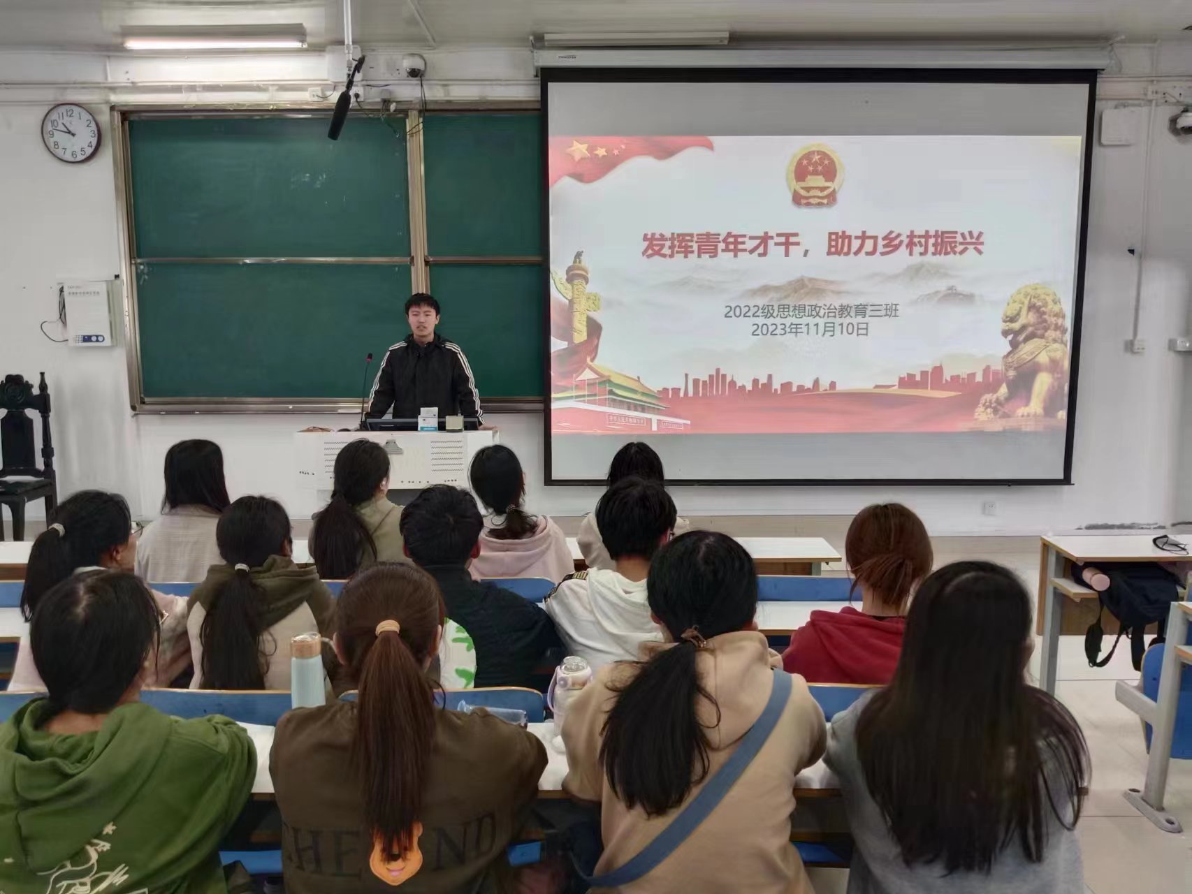 11月10日上午,beat365亚洲版官网2022级思想政治教育三班在社科楼514教室召开“发挥青年才干,助力乡村振兴”主题团课。beat365官网2022级思想政治教育三班全体成员共同参与本次团课,团课由团支书余浩洋主持。