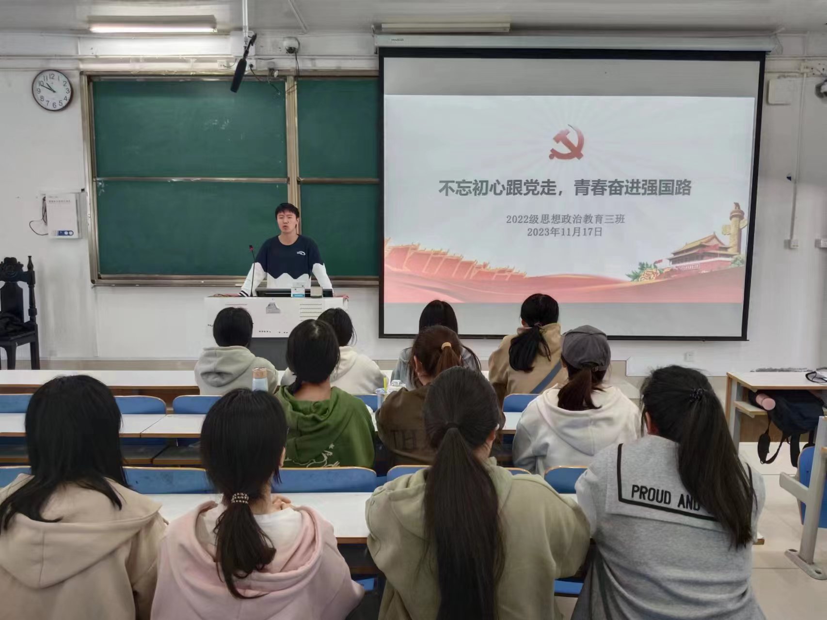 11月17日上午,beat365亚洲版官网2022级思想政治教育三班在社科楼514教室召开“不忘初心跟党走,青春奋进中国路”主题团课。beat365官网2022级思想政治教育三班全体成员共同参加本次团课,团课由团支书余浩洋主持。