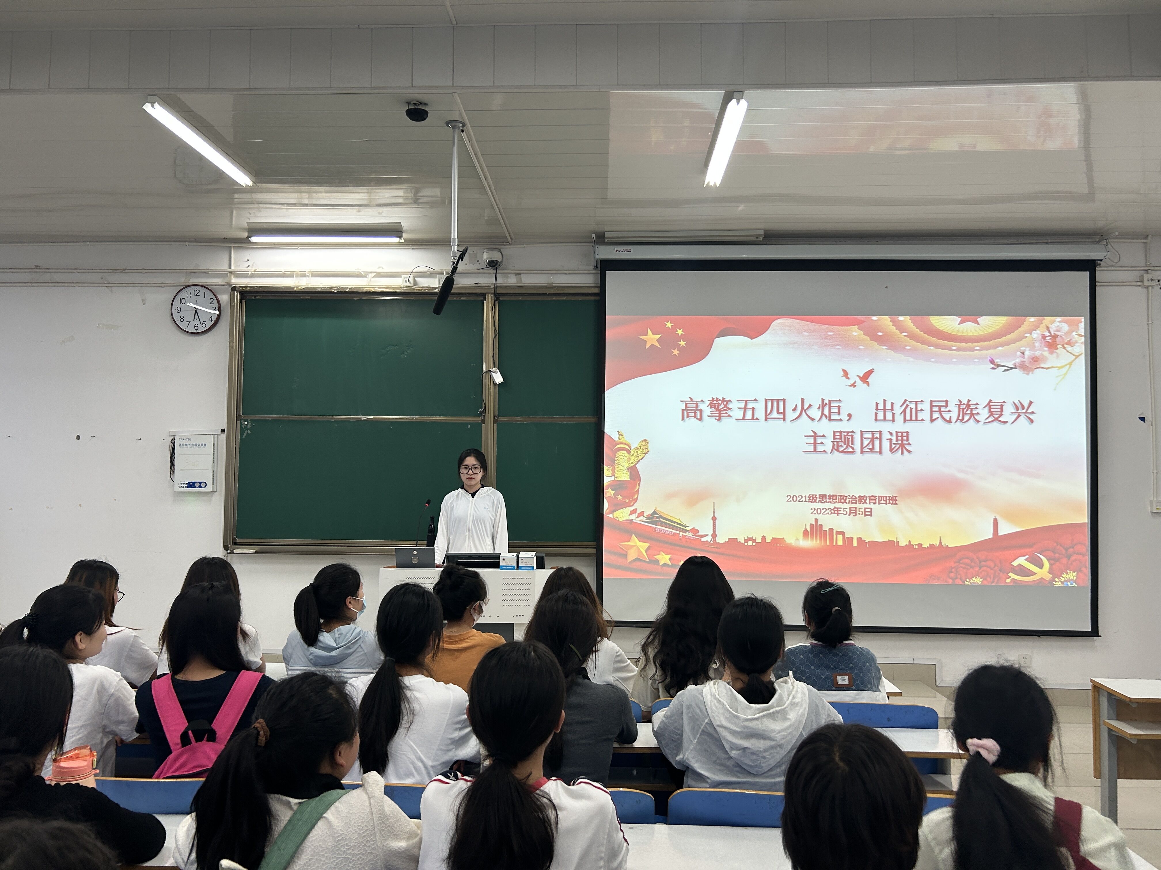 5月5日下午,beat365亚洲版官网2021级思想政治教育四班在社科楼514教室开展“高擎五四火炬,出征民族复兴”主题团课。2021级思想政治教育四班全体团员参加本次团课。团课由团支书刘珂含主持。