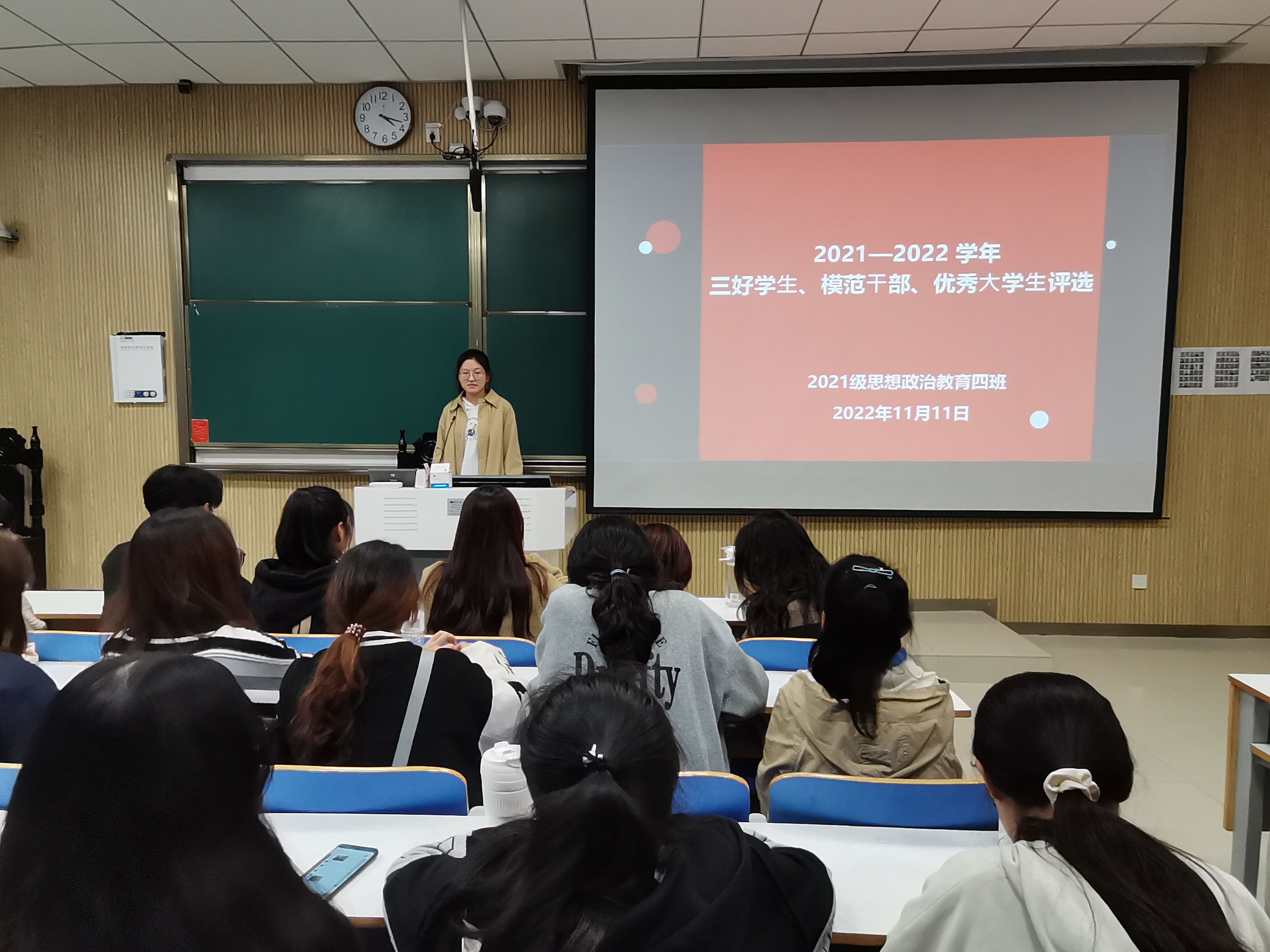 11月11日下午,beat365亚洲版官网2021级思想政治教育四班在社科楼515教室开展2021-2022学年“三好学生、模范干部、优秀大学生”评选会。思想政治教育四班全体同学参加本次会议。会议由团支书刘珂含主持。