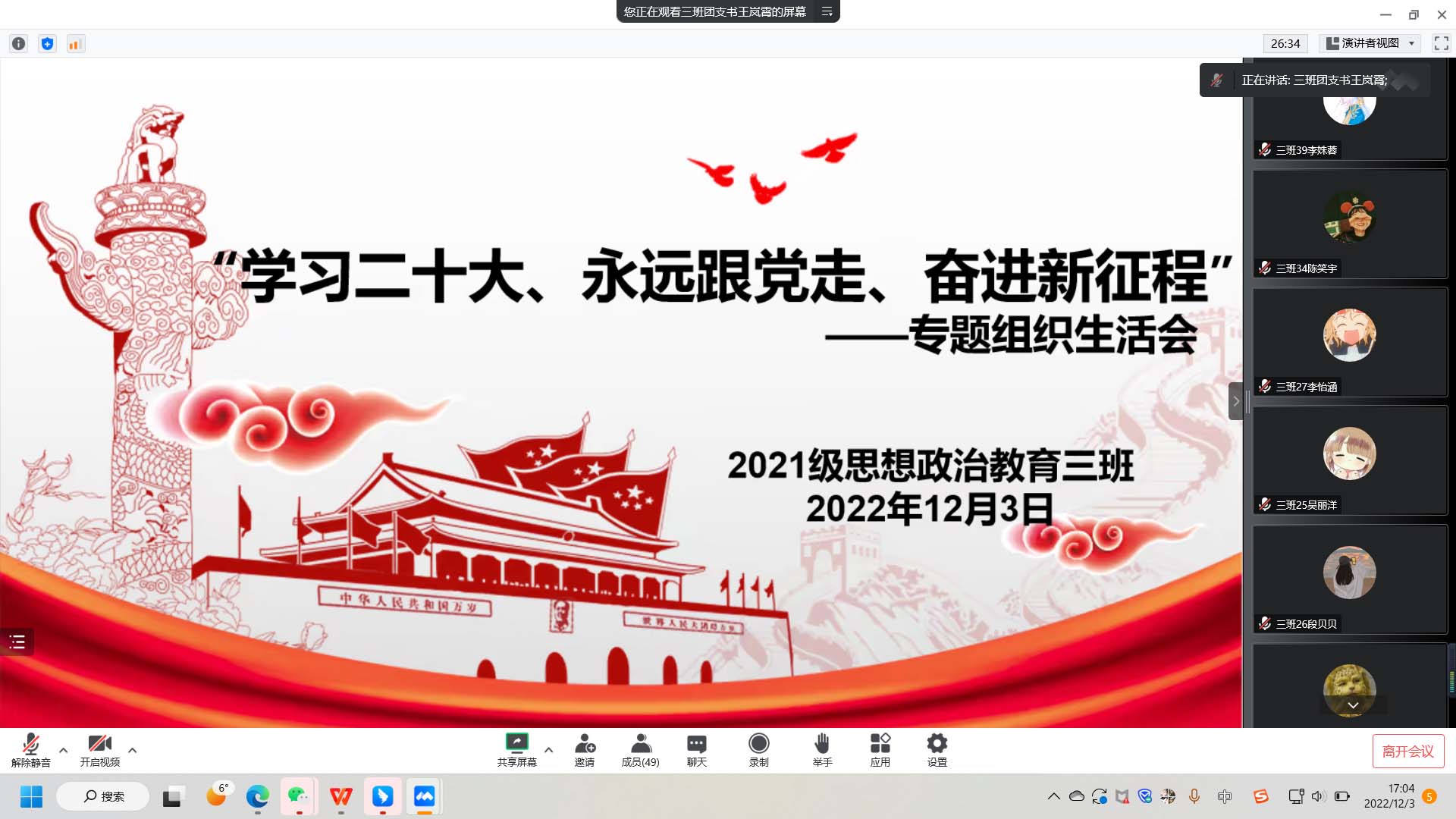 12月3日下午,beat365亚洲版官网2021级思想政治教育三班在线上召开“学习二十大、永远跟党走、奋进新征程”组织生活会。beat365亚洲版官网2021级思想政治教育三班全体成员参与此次会议。会议由团支书王岚霄主持。
