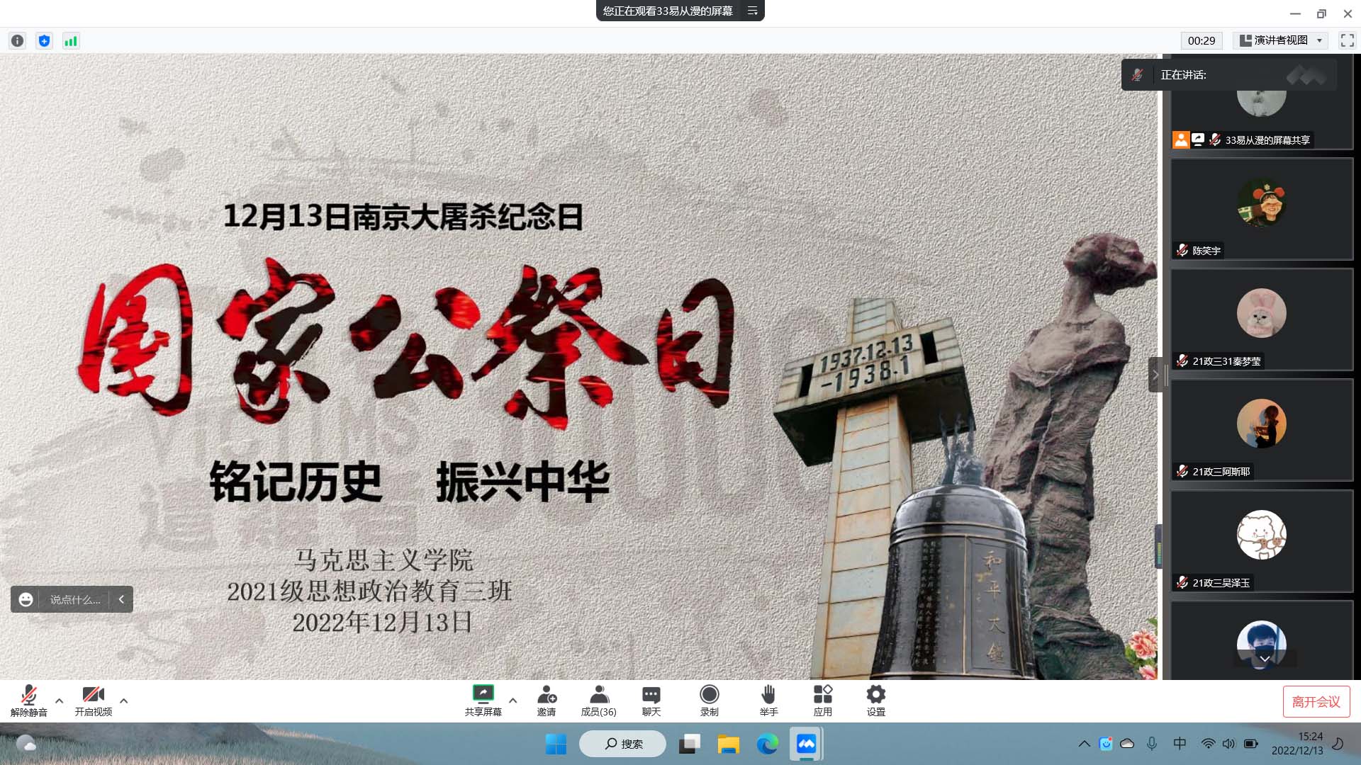 12月13日下午,beat365亚洲版官网2021级思想政治教育三班在线上召开“铭记历史,振兴中华”主题班会。beat365亚洲版官网2021级思想政治教育三班全体成员参与此次会议。会议由班长易从漫主持。