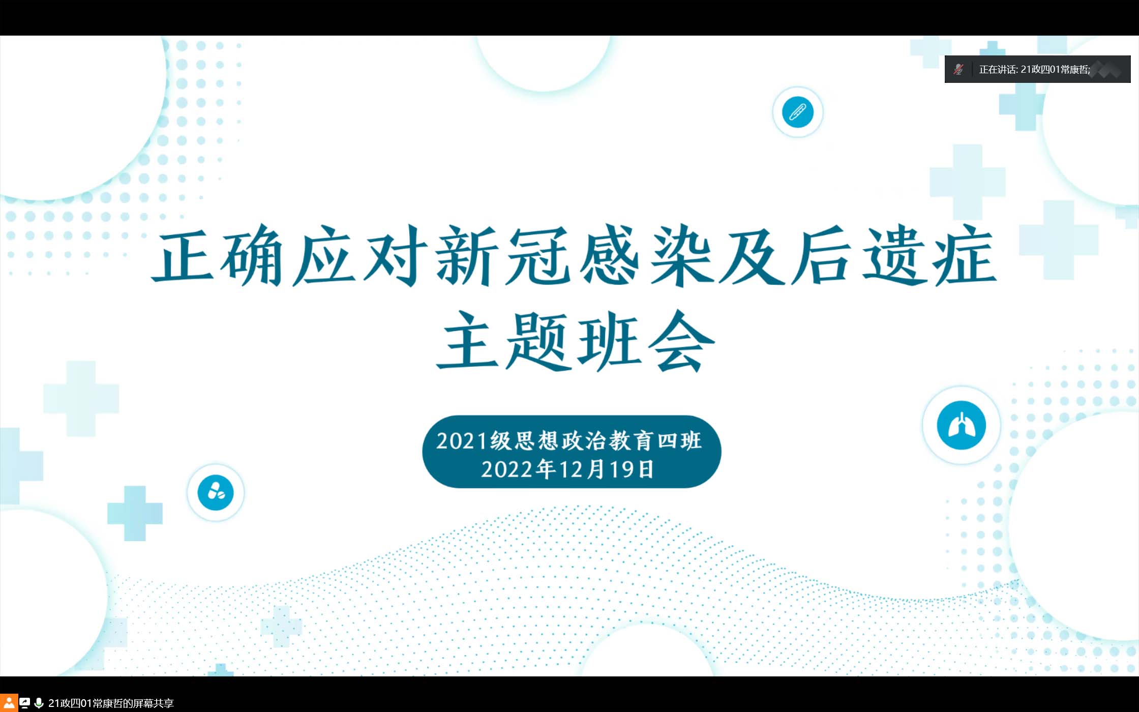 为保障学生及家庭的生命安全和身体健康,增强学生战胜疫情的信心,12月19日下午,beat365亚洲版官网2021级思想政治教育四班线上开展“正确应对新冠感染”主题班会。beat365亚洲版官网2021级思想政治教育四班全体同学参加本次会议。会议由副班长常康哲主持。