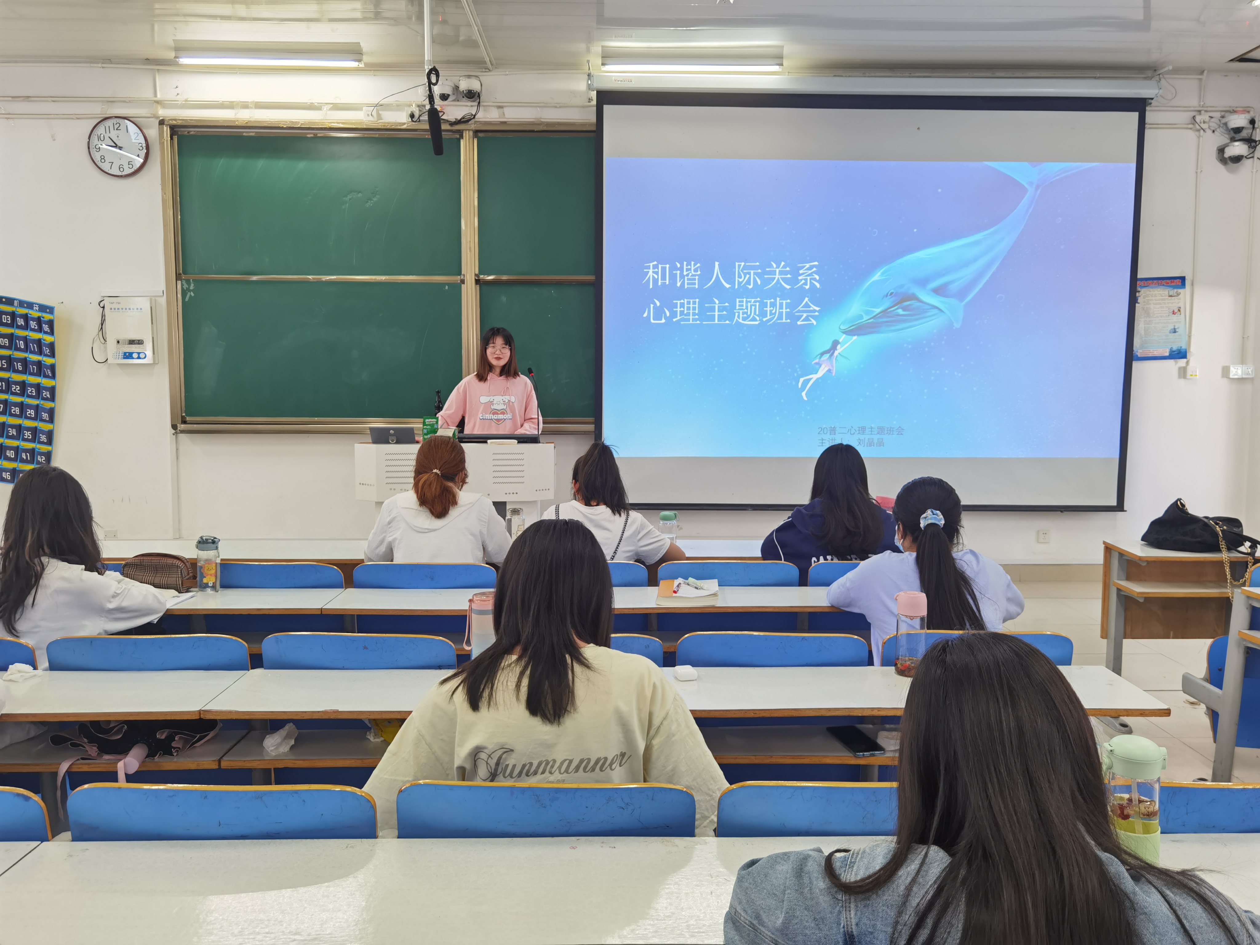 班会主要围绕人际关系概述、人际交往原则、人际交往技巧三个方面展开。首先,高文静对人际关系的基本概念作出说明。她指出,人际关系是人们通过直接交往形成的较为稳定的倾向性情感联系,是人们之间相对稳定的情感纽带。随后,她简要介绍了人际交往中的四个基本原则并表示,平等待人、宽松谦让、诚实守信、互利互惠四个原则是人际交往的基石和稳定器,同学们要积极内化养成和外化应用。最后,刘晶晶为同学们分享了寻找共同爱好、学会适当示弱等人际交往中的实用小技巧,贴近生活、实操性强,获得了同学们的广泛认同。