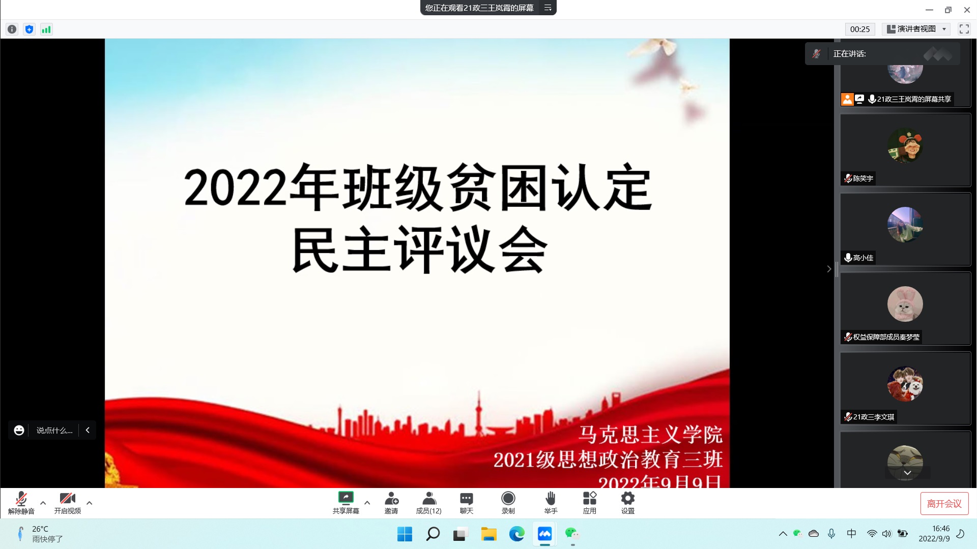 9月9日下午,beat365亚洲版官网2021级思想政治教育三班召开线上2022年班级贫困认定民主评议会。2021级思想政治教育三班贫困认定委员团全体成员以及权益保障部秦梦莹、宣传委员陈笑宇参与此次会议。会议由团支书王岚霄主持。