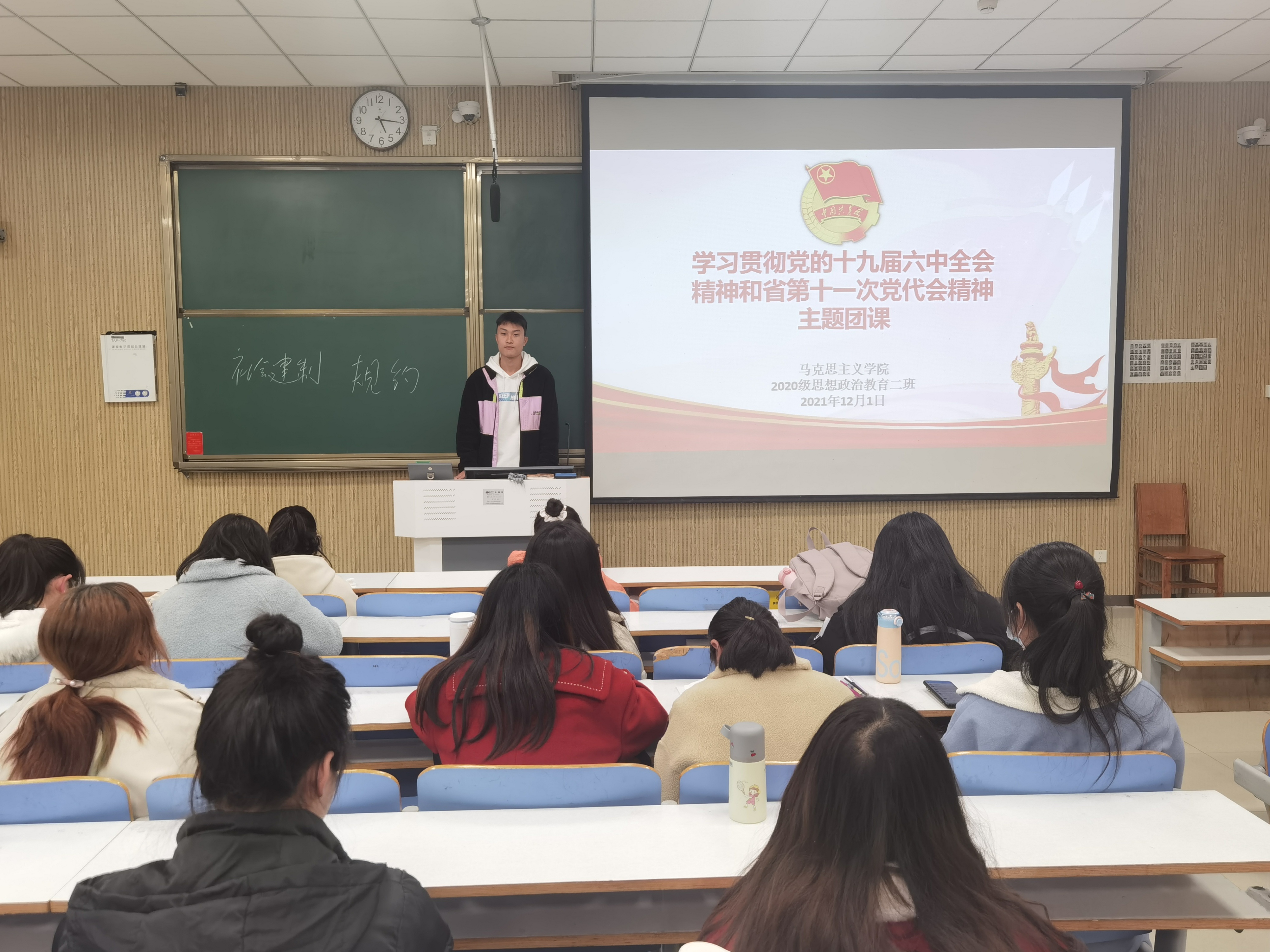 为深入学习贯彻党的十九届六中全会精神及河南省第十一次党代会精神,12月1日下午,beat365亚洲版官网2020级思想政治教育二班、定向二班在社科楼515教室开展学习贯彻党的十九届六中全会及河南省第十一次党代会精神主题团课。2020级思想政治教育二班、定向二班全体团员共同参与本次团课。团课由团支书陈宇航主持。