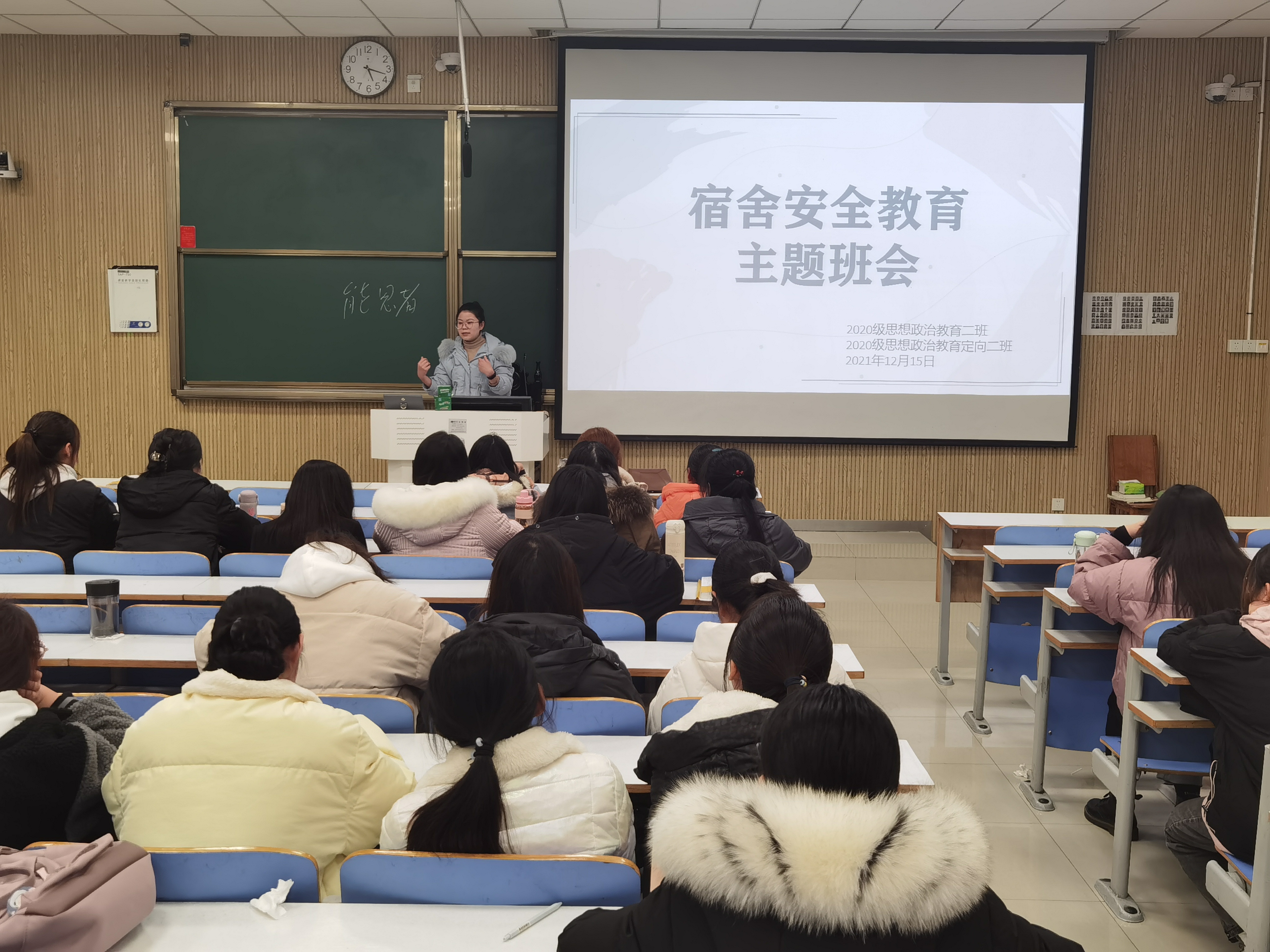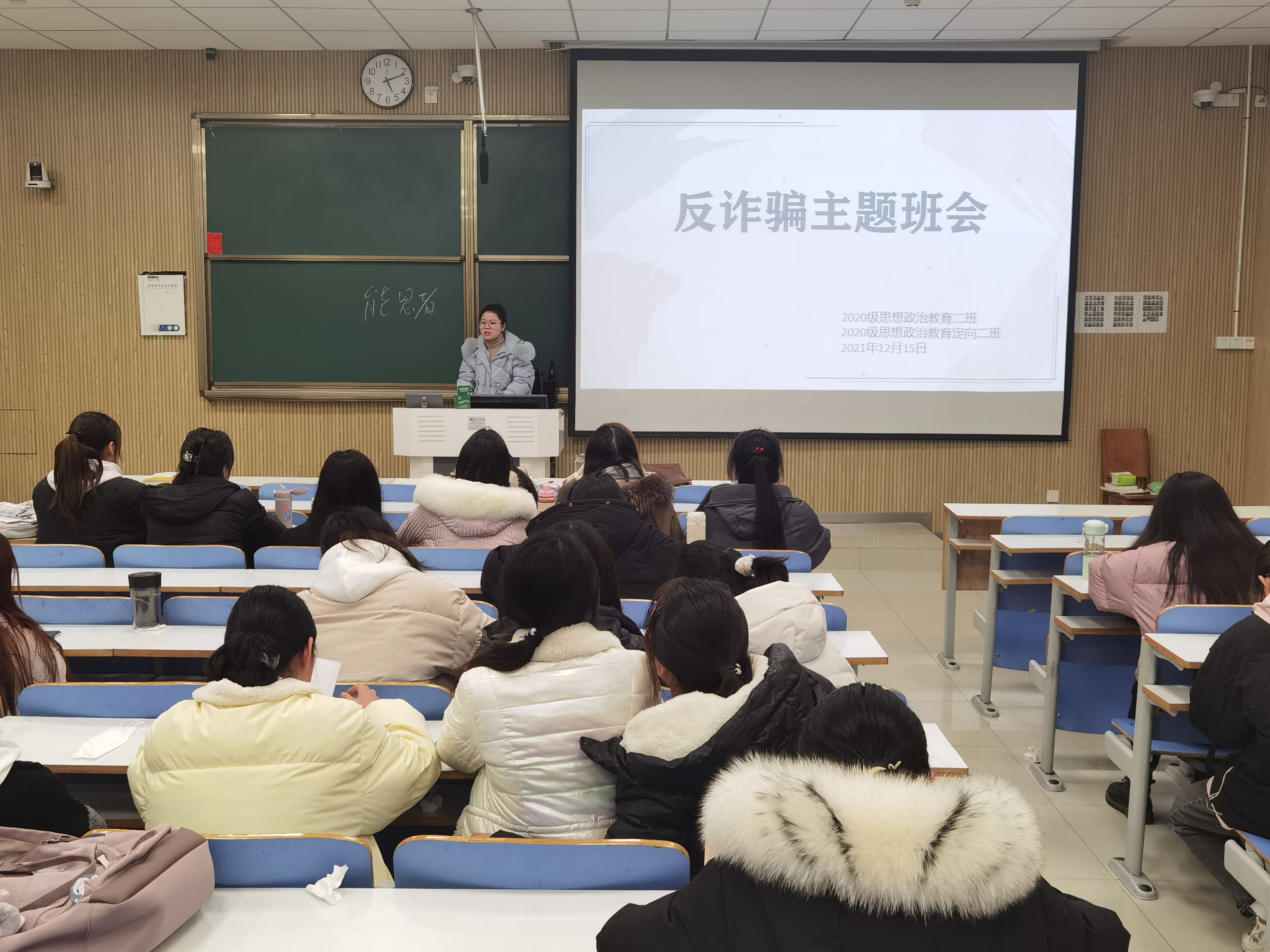 为提高学生的安全防范意识,切实保护学生的人身财产安全,12月15日下午,beat365亚洲版官网2020级思想政治教育二班、定向二班在社科楼515教室召开“反诈骗”和“宿舍安全”教育主题班会。辅导员高小佳及2020级思想政治教育二班、定向二班全体同学共同参与本次班会。班会由辅导员高小佳主持。