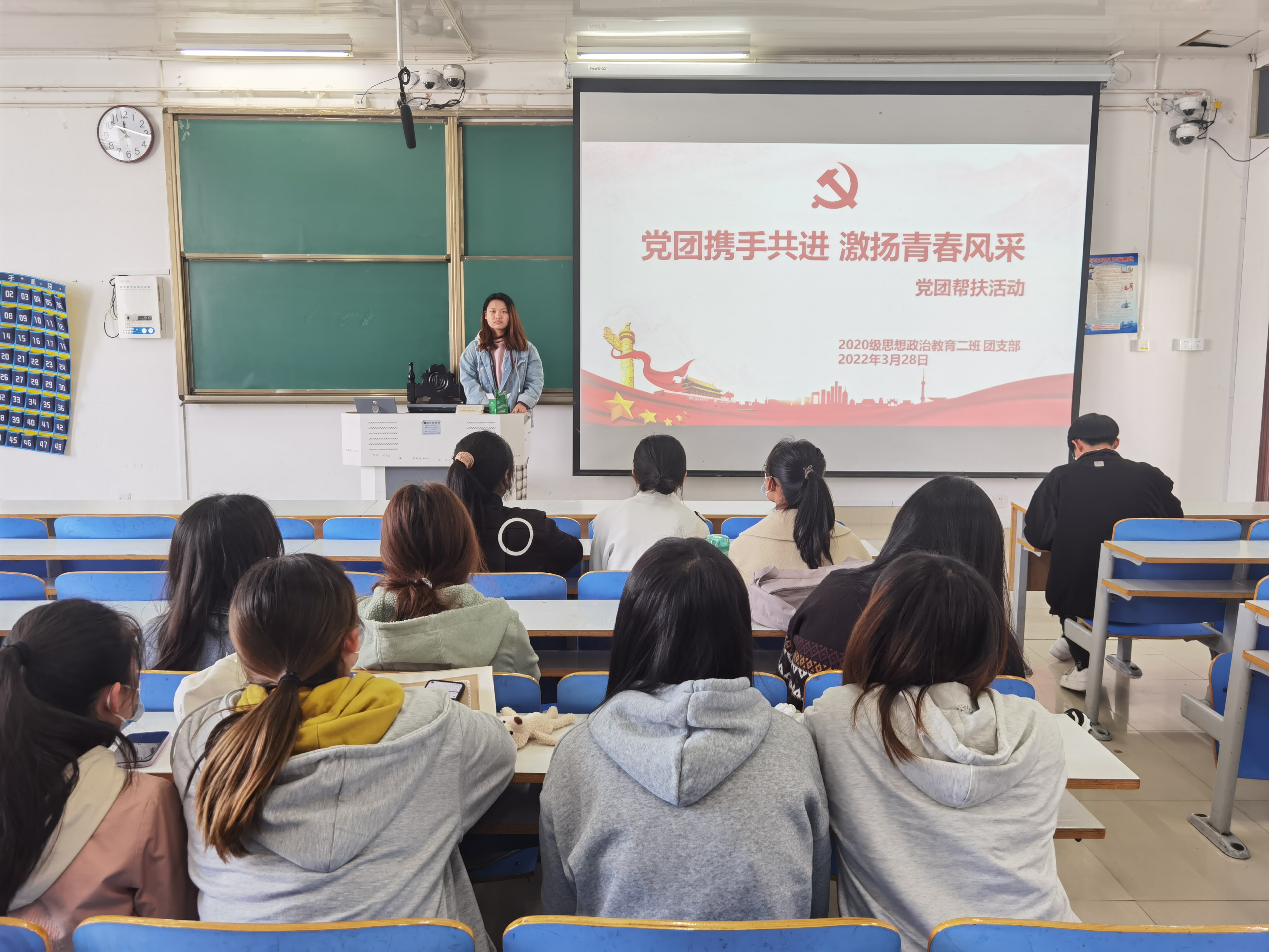 3月28日上午,beat365亚洲版官网2020级思想政治教育二班在社科楼514教室召开“党团携手共进,激扬青春风采”党团帮扶主题班会。2019级预备党员代表王明亮、周永宁及2020级思想政治教育二班全体团员共同参与本次班会。班会由团支书陈宇航主持。