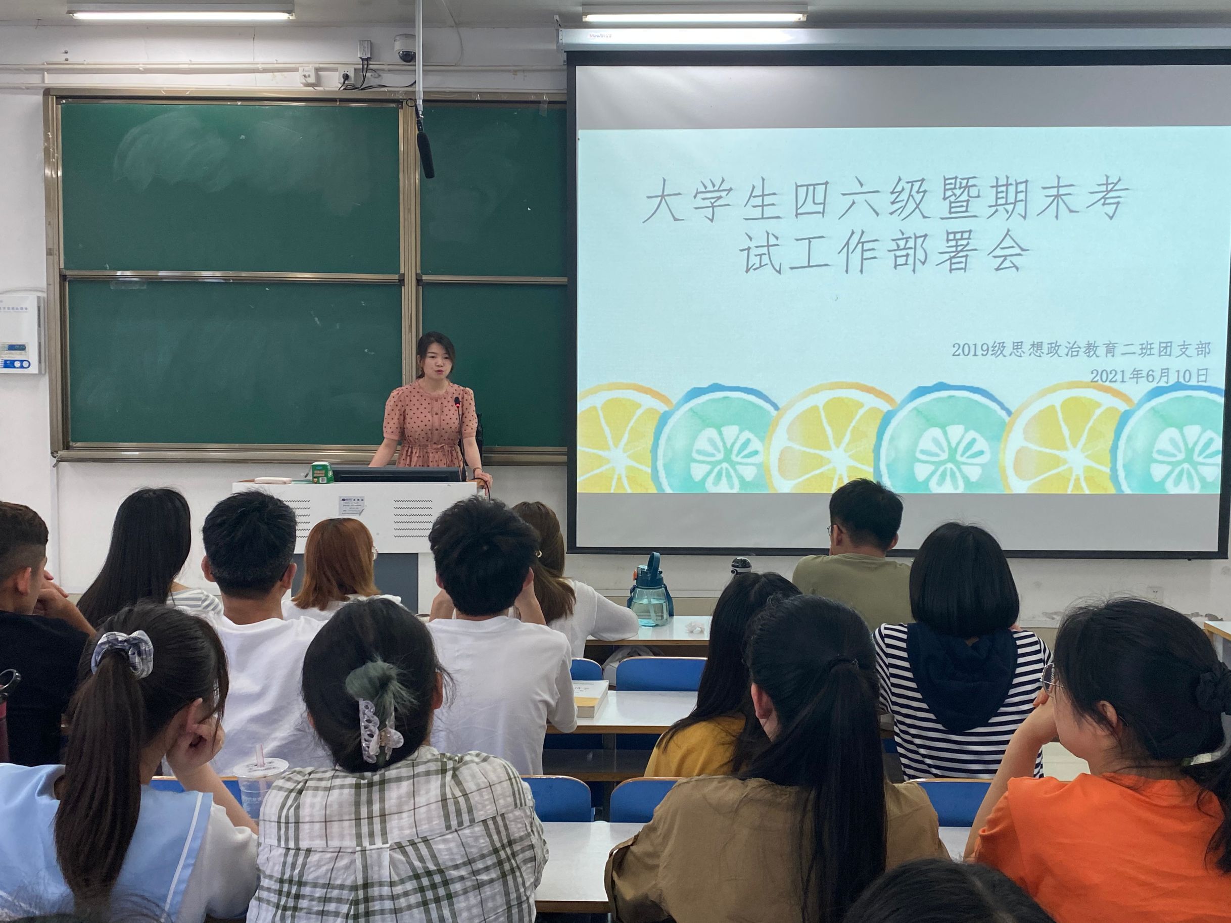 为严肃考风考纪,营造良好的学习、考试氛围,6月10日上午,beat365官网2019级思想政治教育二班在社科楼516教室召开大学生四六级暨期末考试部署会。团委老师陶青青及2019级思想政治教育二班全体成员共同参会。会议由陶青青主持。