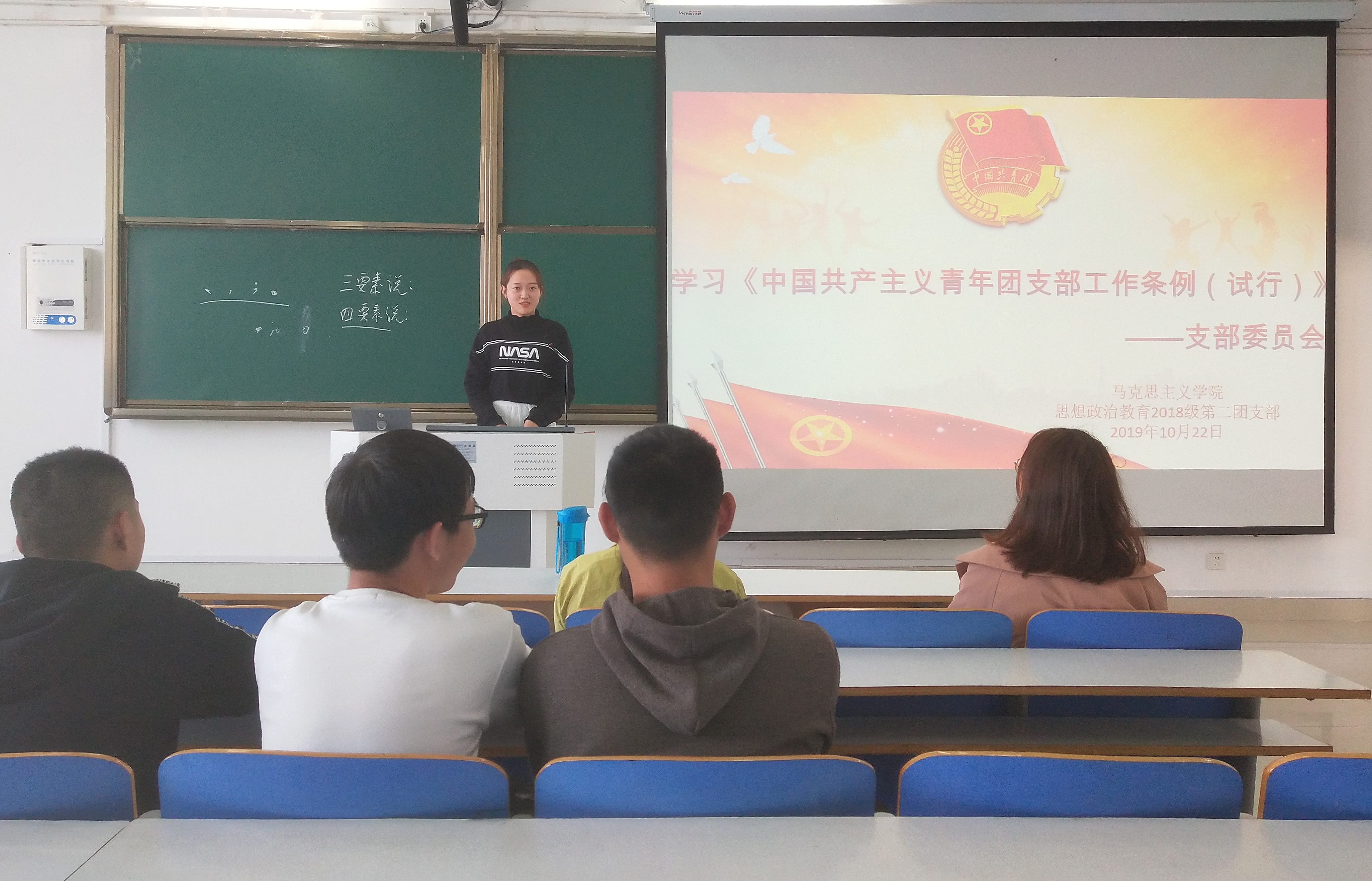 10月22日上午,beat365官网2018级思想政治教育第二团支部在社科楼514教室顺利开展了主题为“学习《中国共产主义青年团支部工作条例(试行)》”支部委员会。会议由团支部书记黄子晋主持。