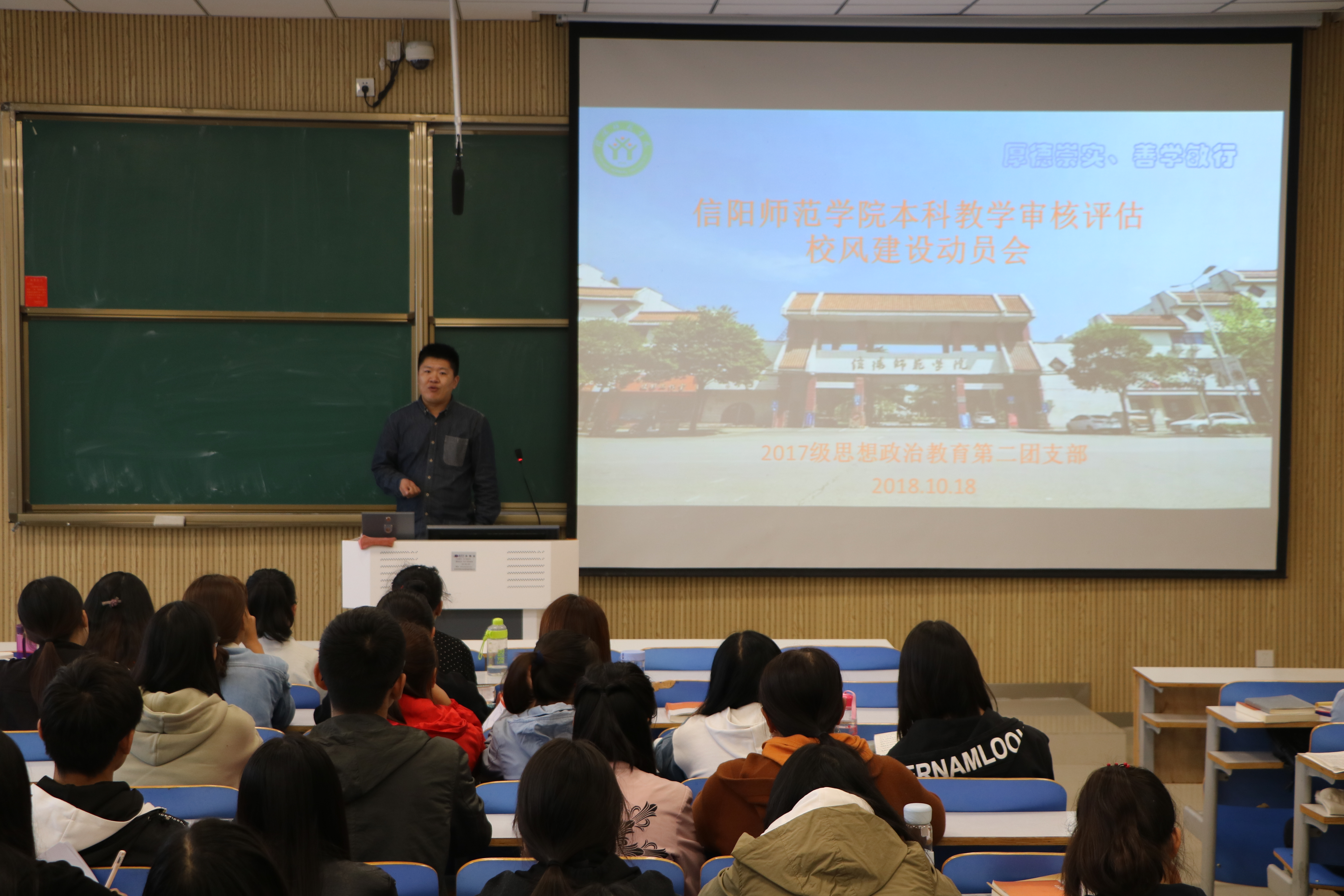 10月18日下午,思想政治教育第二团支部在社科楼515教室召开了本科教学审核评估校风建设动员会。班会由辅导员孙绪曙主持。
