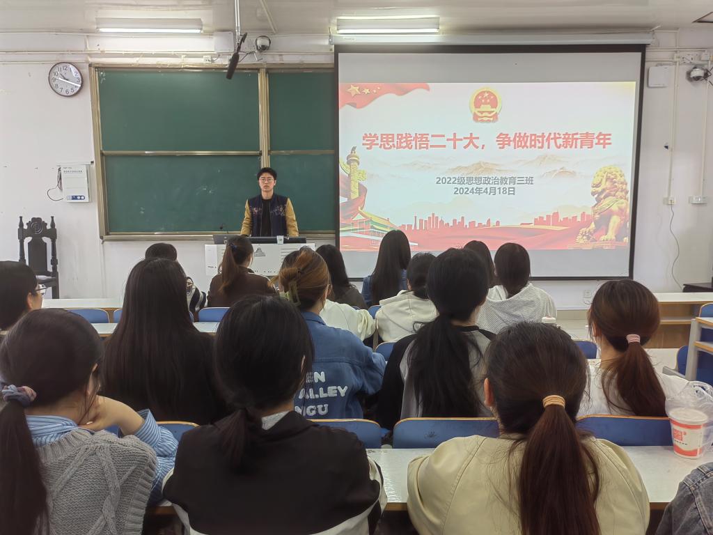 学习新思想,迈进新征程。为全面学习贯彻党的二十大会议精神,4月18日上午,beat365亚洲版官网2022级思想政治教育三班在社科楼514教室召开“学思践悟二十大,争做时代新青年”主题团课。2022级思想政治教育三班全体成员共同参与团课,团课由团支书余浩洋主持。