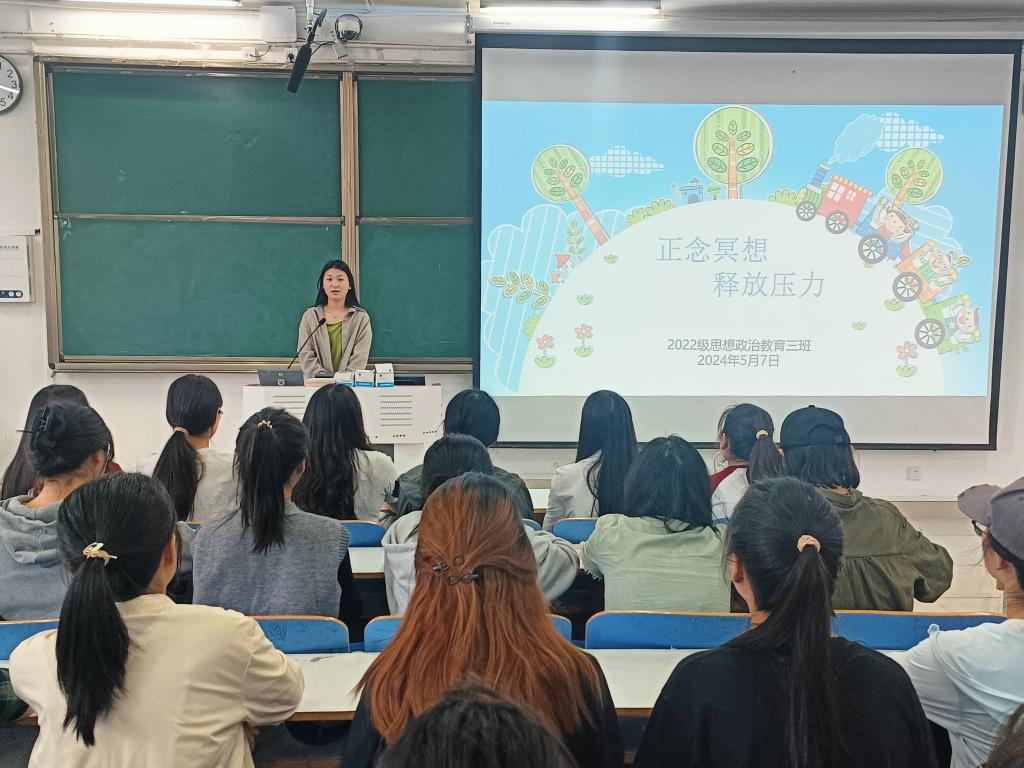 为全面加强和改进新时代学生心理健康教育工作,普及和宣传心理健康知识,构建健康和谐的身心秩序,5月7日上午,beat365亚洲版官网2022级思想政治教育三班在社科楼514教室召开“正面冥想,释放压力”心理健康主题班会。beat365官网2022级思想政治教育三班全体成员共同参与此次班会。班会由心理委员张韶涵主持。